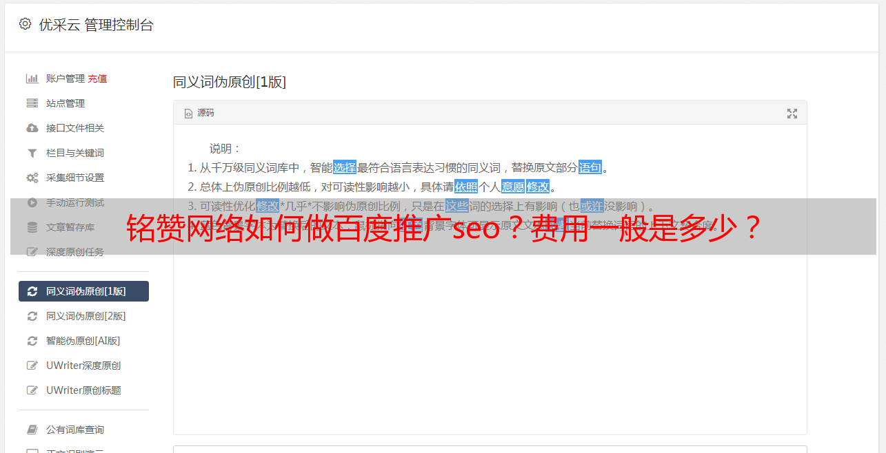 优采云 发布时间: 2021-08-23 04:20铭赞网络如何做百度推广seo?费用一般是多少?