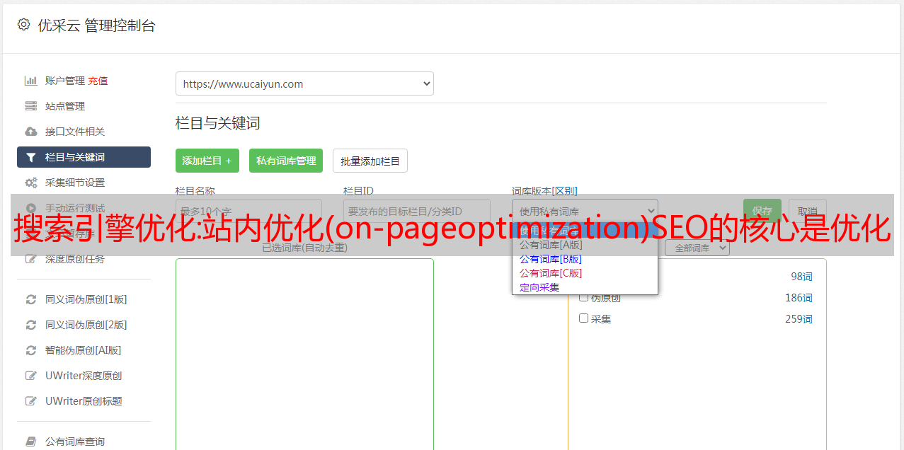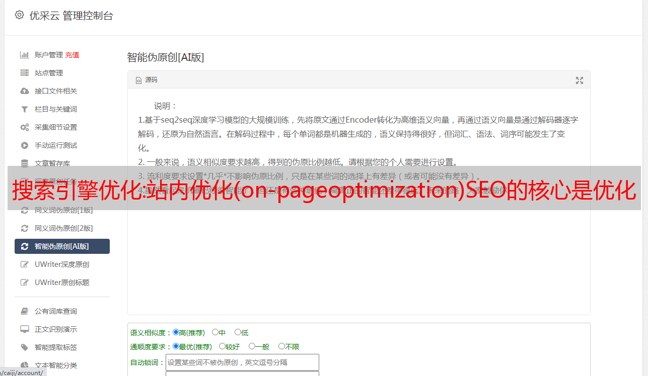 优采云 发布时间: 2021-08-23 22:41搜索引擎优化:站内优化(on-pageoptimization)SEO的核心是优化