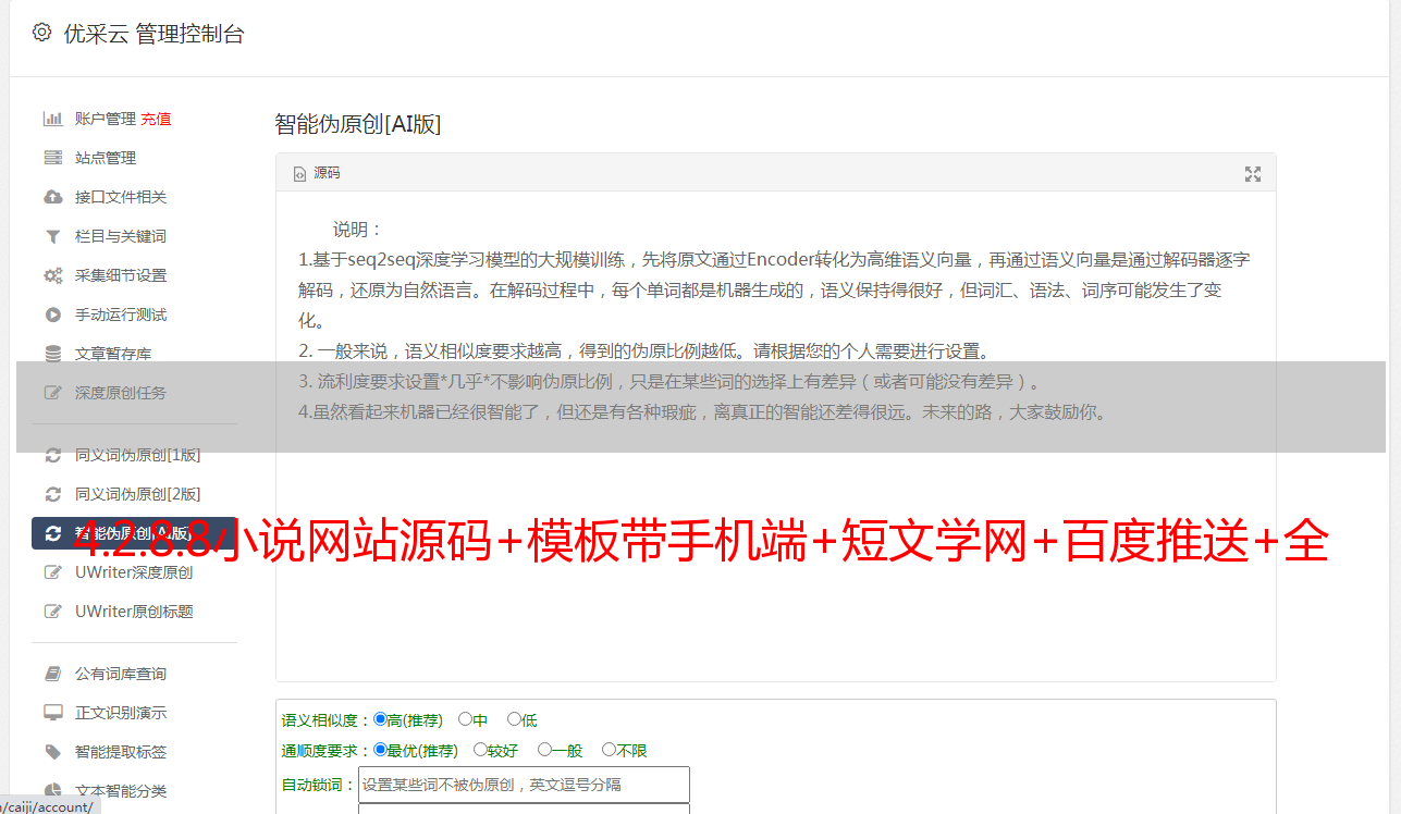 4.2.8 版本为新开发,新版UI,更扁平化,增加原创专区,新闻稿,书单发布,采集日志,百度推送,神马push,推送日志功能。