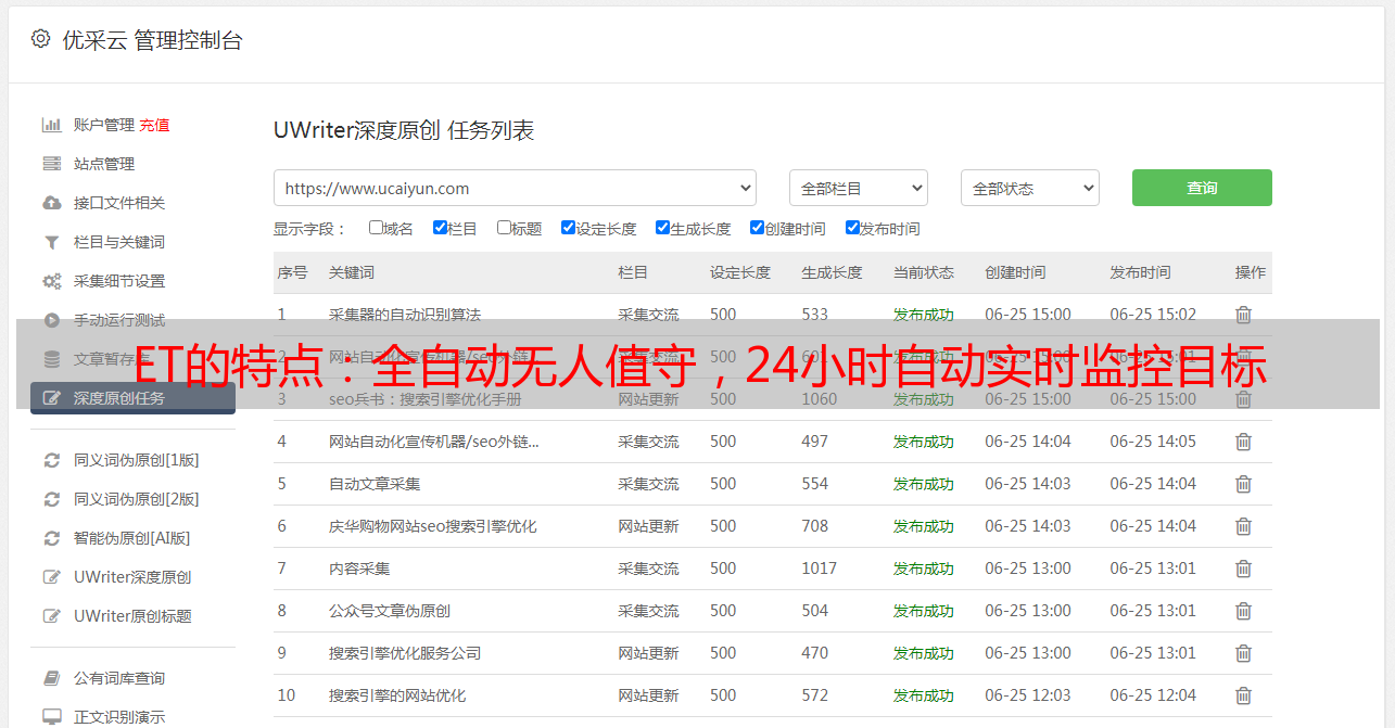 优采云 发布时间: 2021-08-27 05:04ET的特点:全自动无人值守,24小时自动实时监控目标