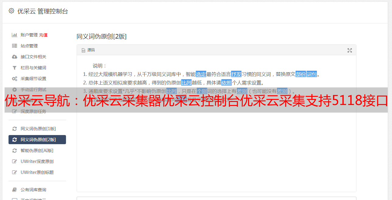 5118 一键智能重写API接口:可用于处理采集的数据标题和内容。不支持保留html标签,只支持纯文本,但是优采云做了一些处理,尽量保留图片和排版;