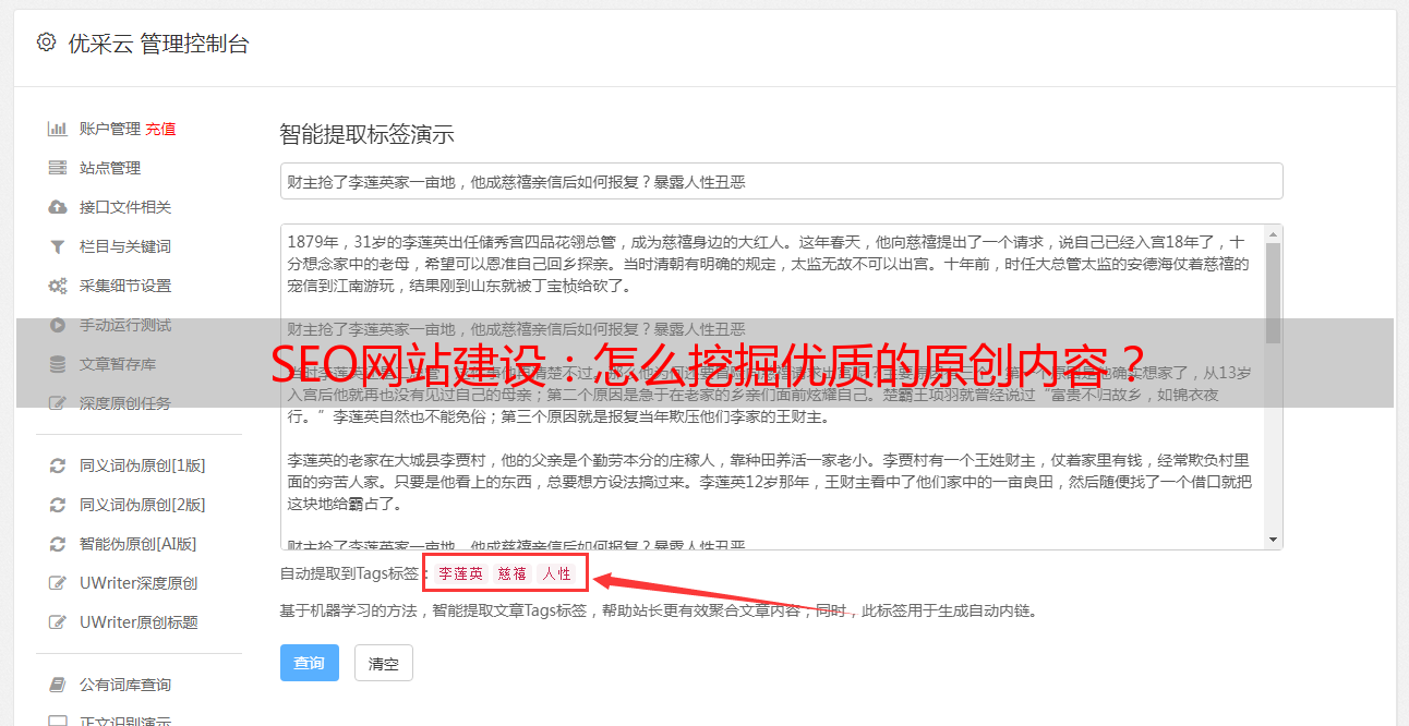 优采云 发布时间: 2020-08-14 17:32网站内容建设是一个超大的命题,从宏观上包括网站产品设计制做和用户营运维护,既同时通过内容和用户两个维度增强其在百度搜索引擎中的评价得分。内容建设涉及的部门也好多,不仅产品部外,还要包括编辑部、运营部,其实也少不了SEO部,其实,优质的网站内容必须是多部门协同合作的产物。