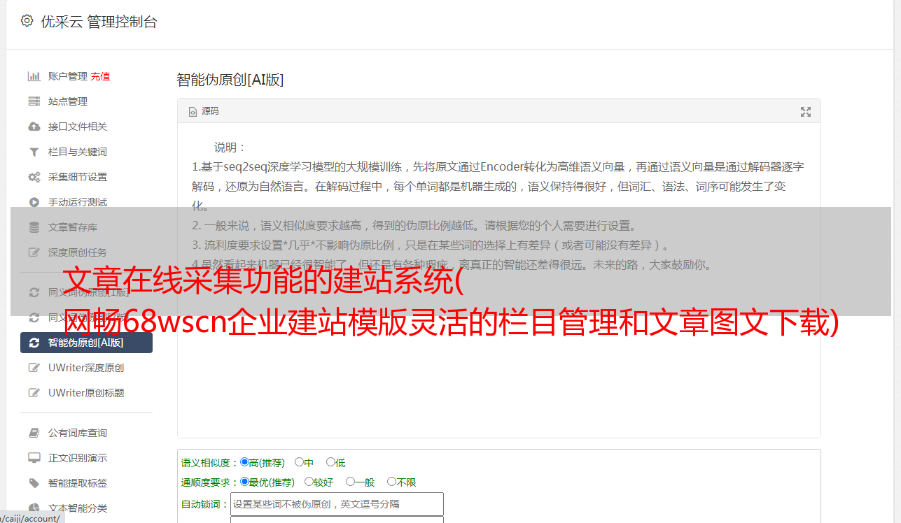 文章在线采集功能的建站系统( 网畅68wscn企业建站模版灵活的栏目管理和文章图文下载)