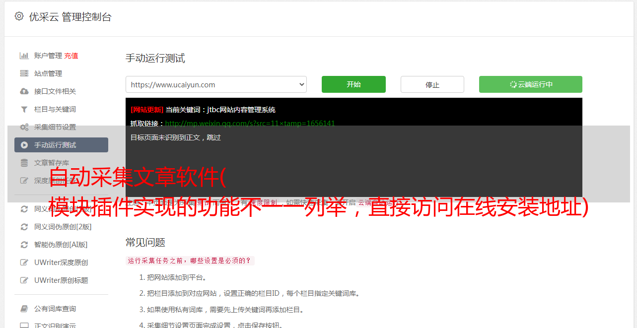 安装中大云采集模块插件后,发布内容上方会出现采集器控制面板,输入关键词或者网址可以是智能云采集任何你想要的内容,易学,易懂,好用,成熟稳定,是新手站长和网站编辑必备的模块插件。