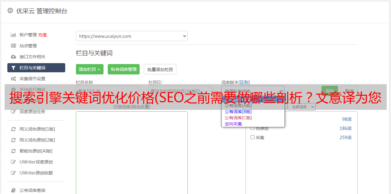 优采云 发布时间: 2021-08-31 03:05搜索引擎关键词优化价格(SEO之前需要做哪些剖析?文意译为您解析)