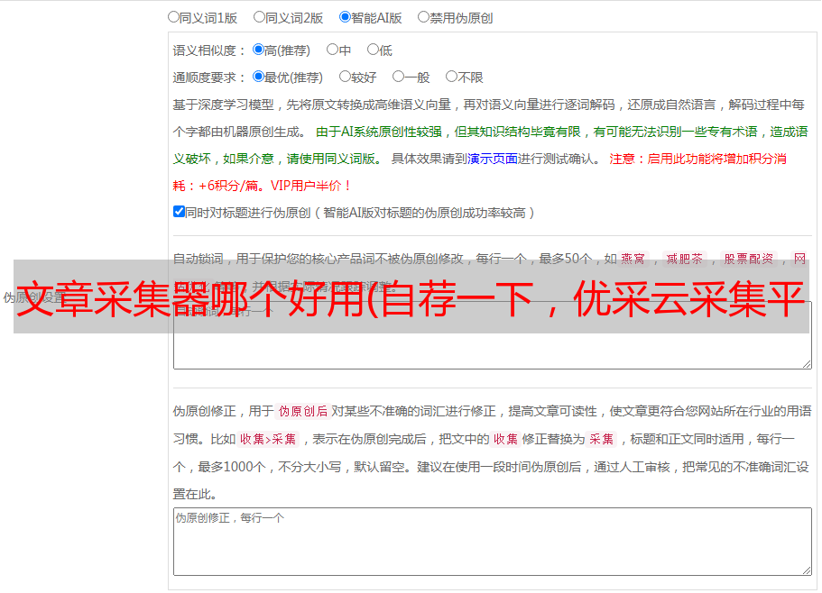 5、 同义词替换:可以使用同义词库(官方提供,用户自定义)替换指定字段(如内容、标题等)中的内容,对收录也有很大帮助@。是一种内容的替换。