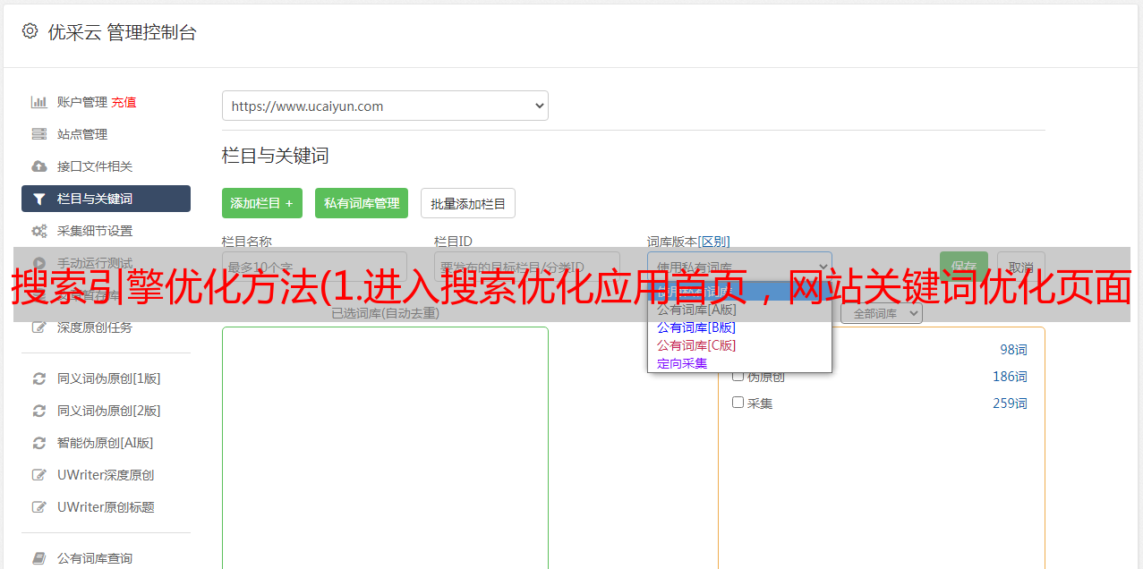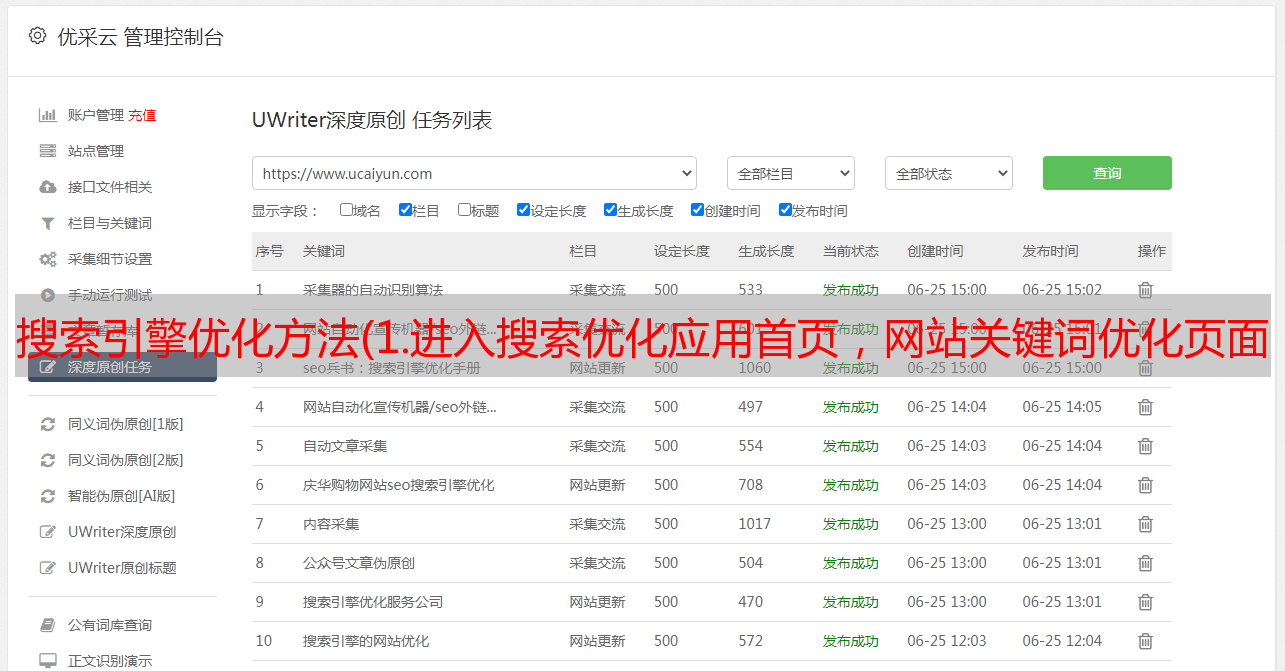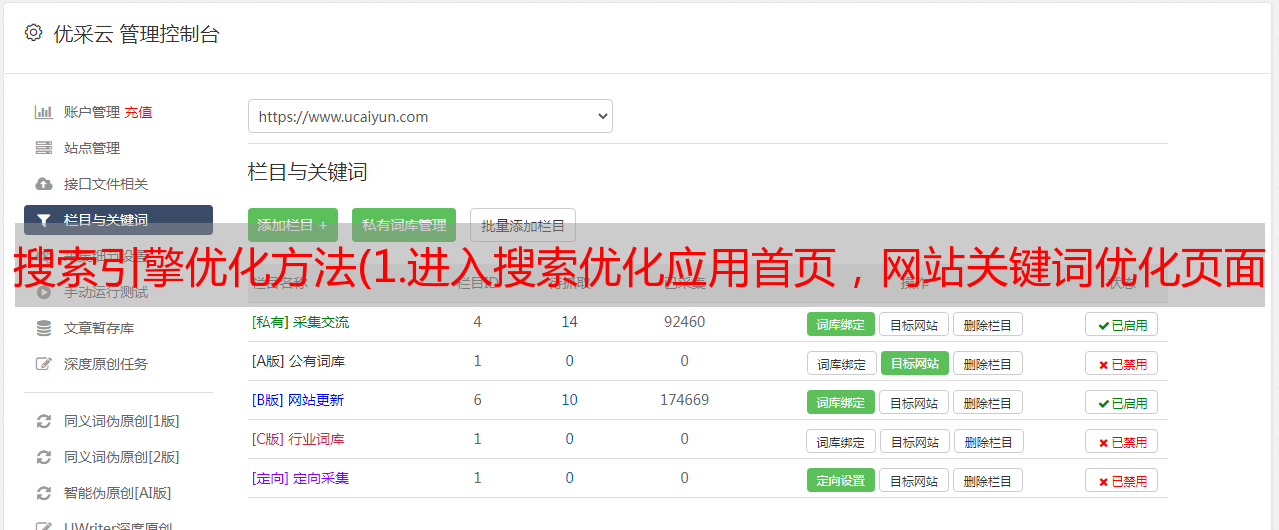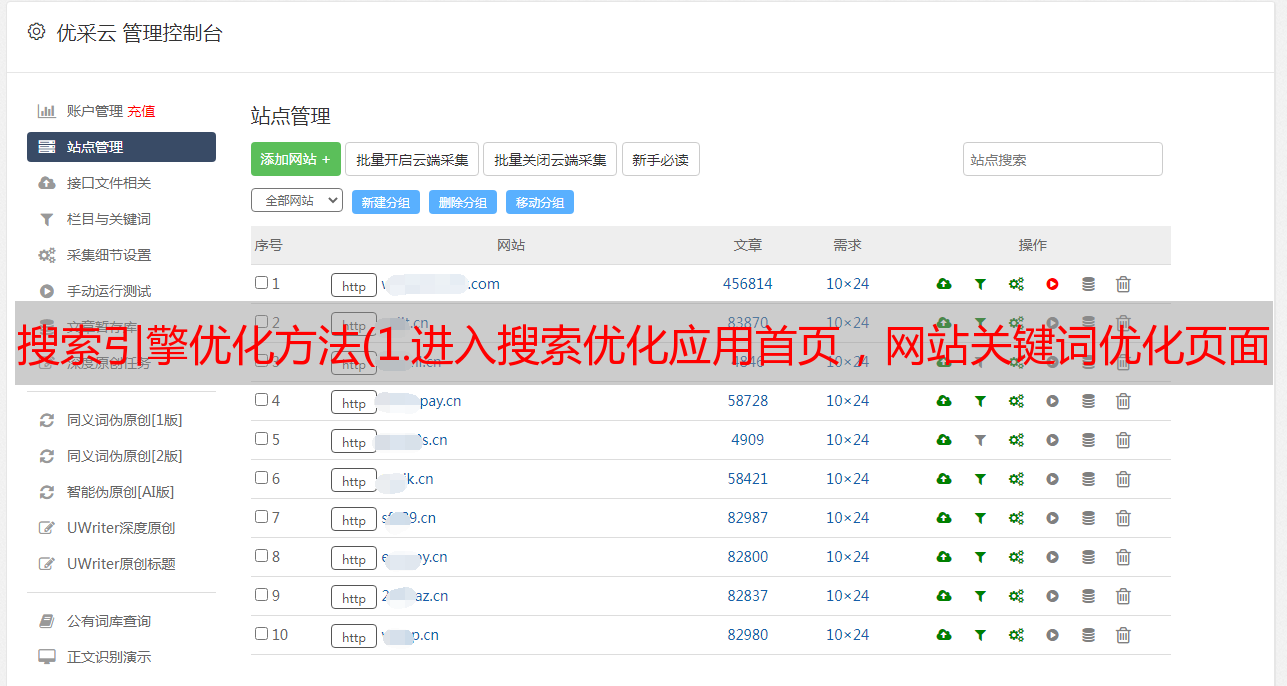 优采云 发布时间: 2021-09-01 04:21搜索引擎优化方法(1.进入搜索优化应用首页,网站关键词优化页面,优化