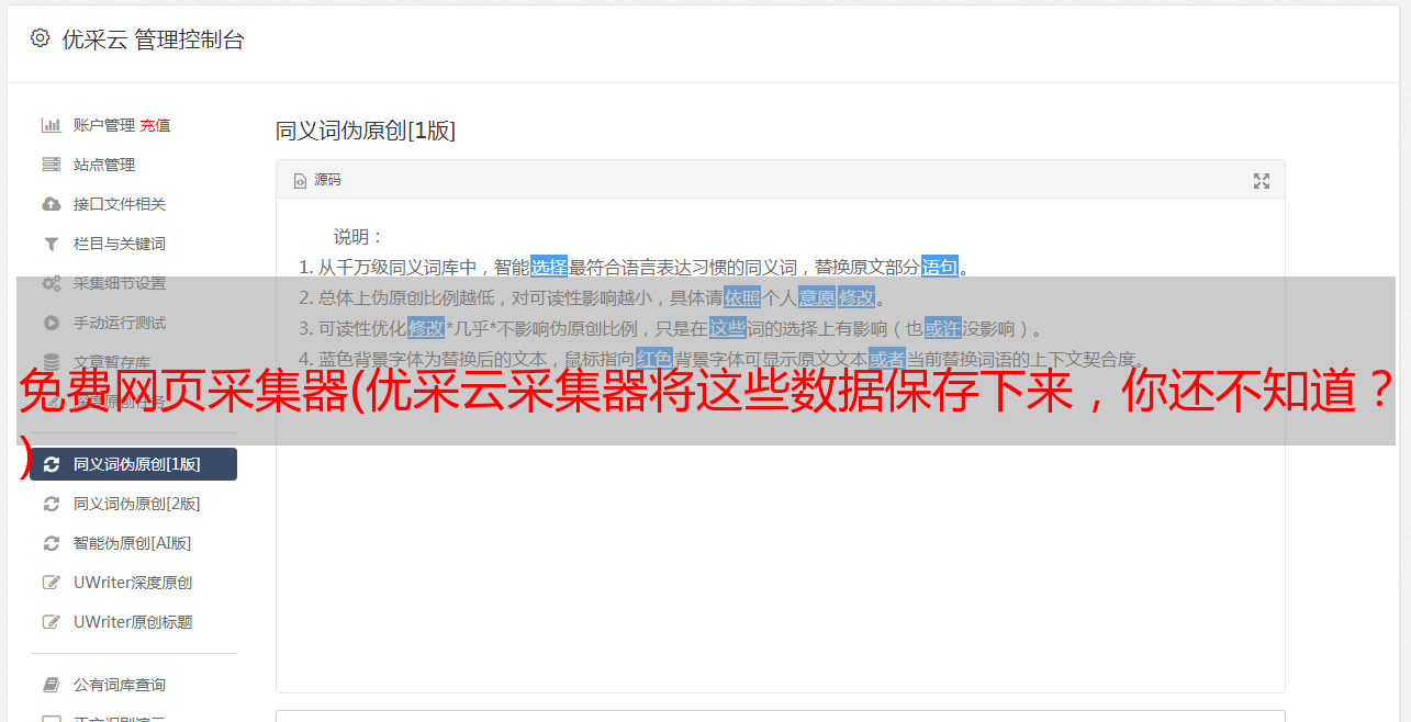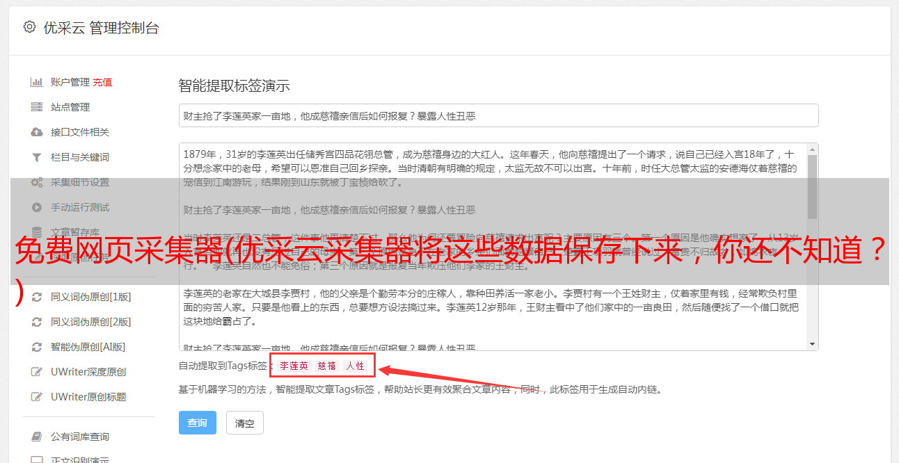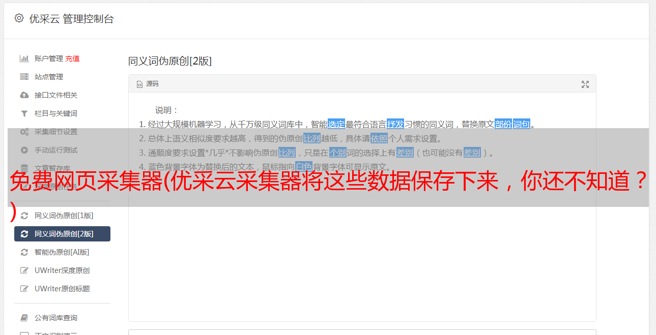 优采云采集器 是一个非常有用的网络信息工具采集。该软件内置浏览器,可以直观地帮助用户采集各种网页内容。操作简单,无需掌握。任何专业的网络知识都可以轻松创建采集 任务,只需单击鼠标即可。 优采云采集器可以自定义采集你需要的网页上的所有信息,并且可以自动识别网页列表、采集字段和分页等,输入采集网址,点击鼠标轻松选择所需的抓取内容; 优采云采集器视化采集器、采集就像积木一样,功能模块可以随意组合,可视化提取或操作网页元素,自动登录、自动发布、验证码自动识别通用浏览器,您可以快速创建自动化脚本,甚至生成独立的应用程序;用户可以使用优采云采集器到采集网页上的一些数据内容,并且这些数据内容可以单独保存,以便用户在浏览网页时如果需要采集资料,可以保存数据并通过这个采集器 使用它。有兴趣的快来下载体验吧!