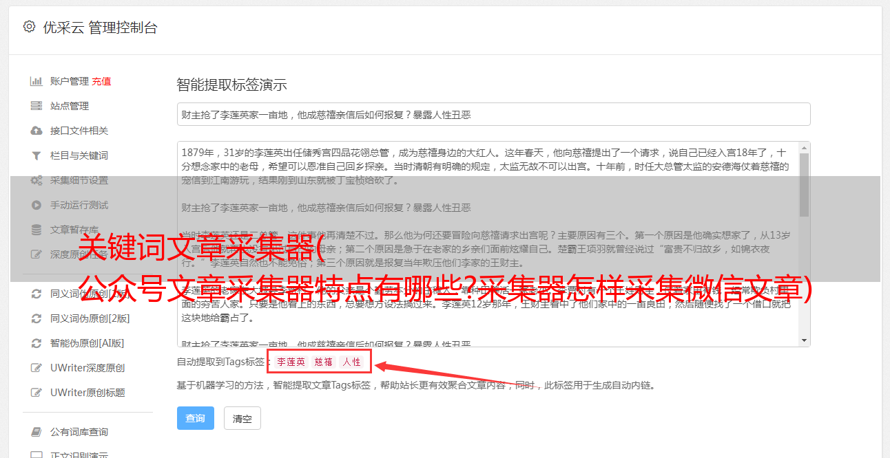 可以批量粘贴关键词进行搜索,选择采集内容日期,可以查看标题和内容伪原创,识别文章是否为原创,支持文章一条到分发给网站