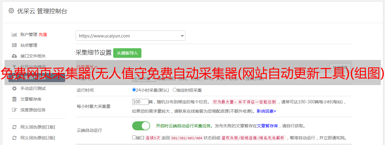 无人值守免费自动采集器(网站Auto Update Tool)是一款绿色中小型网站自动更新工具!免责声明:本软件适用于需要长期更新内容的非临时网站使用,不需要您对现有论坛或网站进行任何更改。