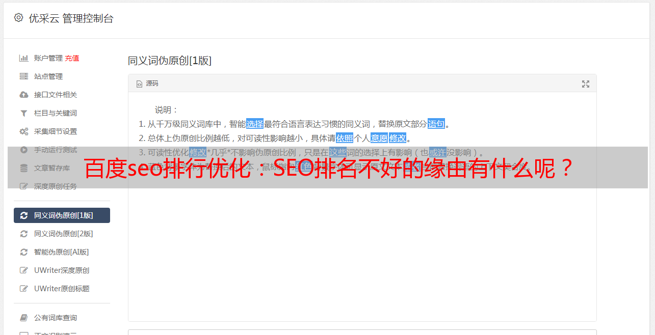 优采云 发布时间: 2020-08-18 18:56百度seo排行优化:SEO排名不好的缘由有什么呢?