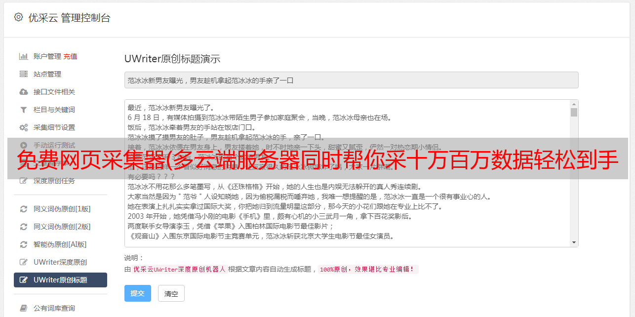 优采云网站数据采集工具是一款非常好用又实用的网络信息提取工具,不仅好用,而且功能强大:点击、登录、翻页,甚至识别验证码,当网页出现错误时,或者多套模板完全不同的时候,也可以根据不同的情况进行不同的处理。喜欢的朋友快来下载吧!