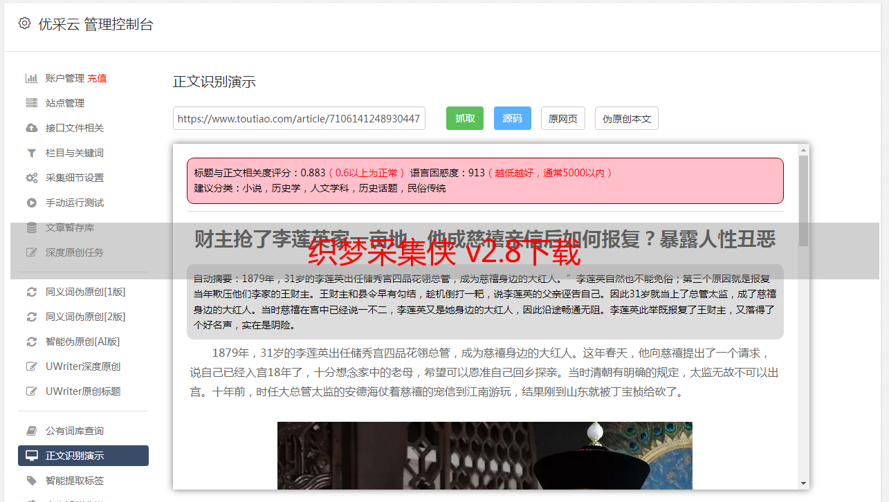 优采云 发布时间: 2020-08-19 07:04织梦采集侠 v2.8下载