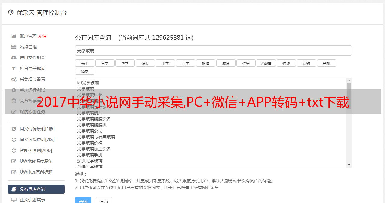 优采云 发布时间: 2020-08-19 07:072017中华小说网手动采集,PC+微信+APP转码+txt下载