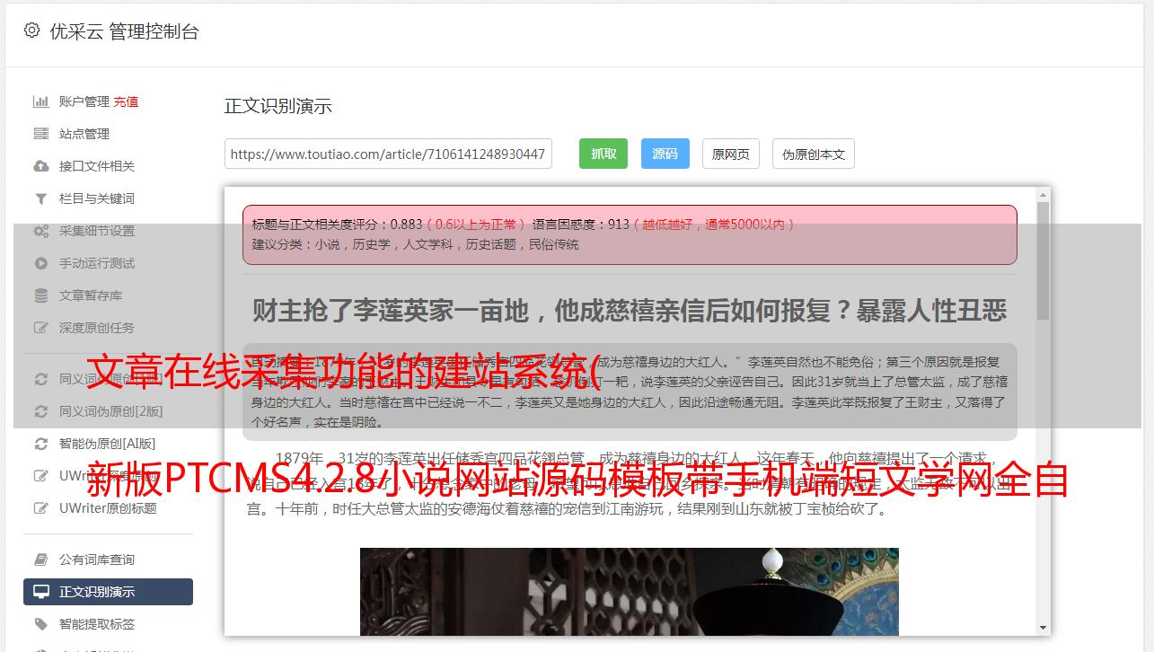 文章在线采集功能的建站系统( 新版PTCMS4.2.8小说网站源码模板带手机端短文学网全自动_全网首发功能介绍)