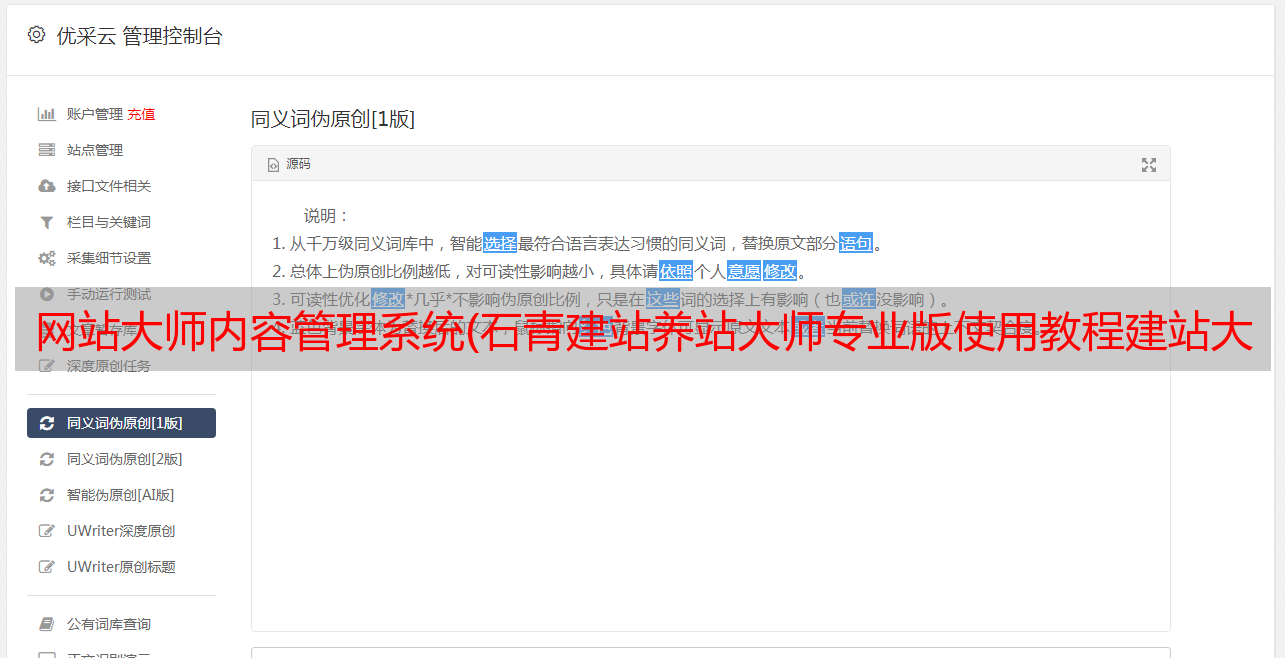优采云 发布时间: 2021-09-07 08:08网站大师内容管理系统(石青建站养站大师专业版使用教程建站大师使用)