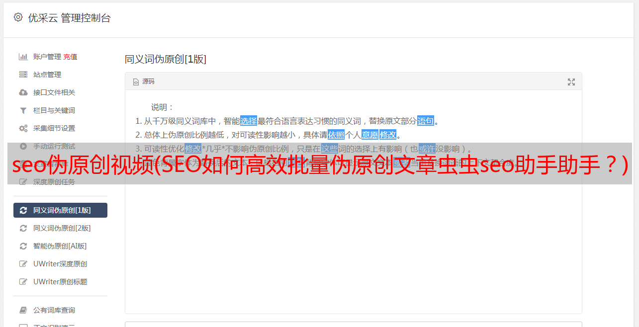 优采云 发布时间: 2021-09-09 21:12seo伪原创视频(SEO如何高效批量伪原创文章虫虫seo助手助手?)