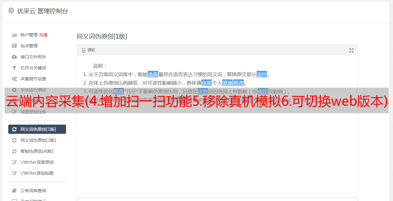 优采云 发布时间: 2021-09-11 01:02云端内容采集(4.增加扫一扫功能5.移除真机模拟6.可切换web版本)