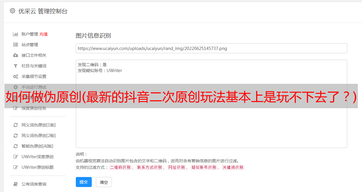 这样一套程序一旦运行起来,就不会有过审或限流的问题。大致思路就是这些,如果有伪原创的朋友,还有什么有效的方法欢迎交流。对于想成为新人伪原创吸粉的人来说,上面介绍的方法完全够用了。