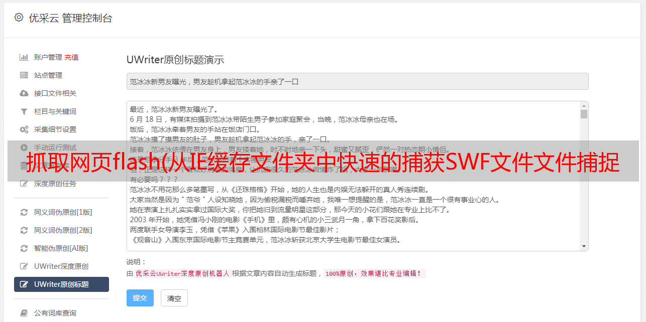 优采云 发布时间: 2021-09-12 04:09抓取网页flash(从IE缓存文件夹中快速的捕获SWF文件文件捕捉提取工具)