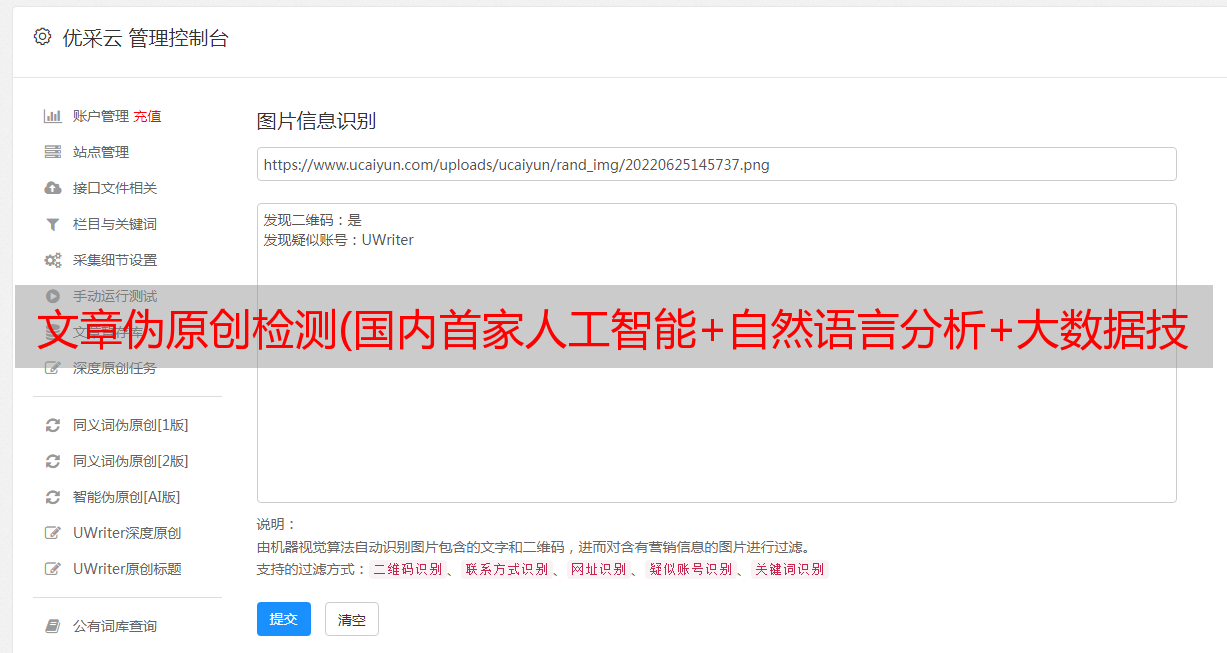 优采云 发布时间: 2021-09-12 06:06文章伪原创检测(国内首家人工智能+自然语言分析+大数据技术该伪原创工具)