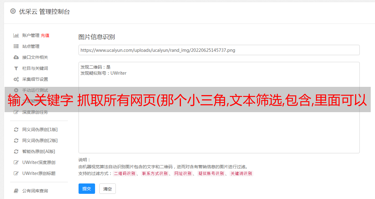 输入关键字 抓取所有网页(那个小三角,文本筛选,包含,里面可以设置两个条件 )