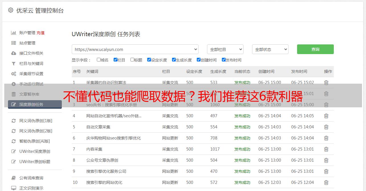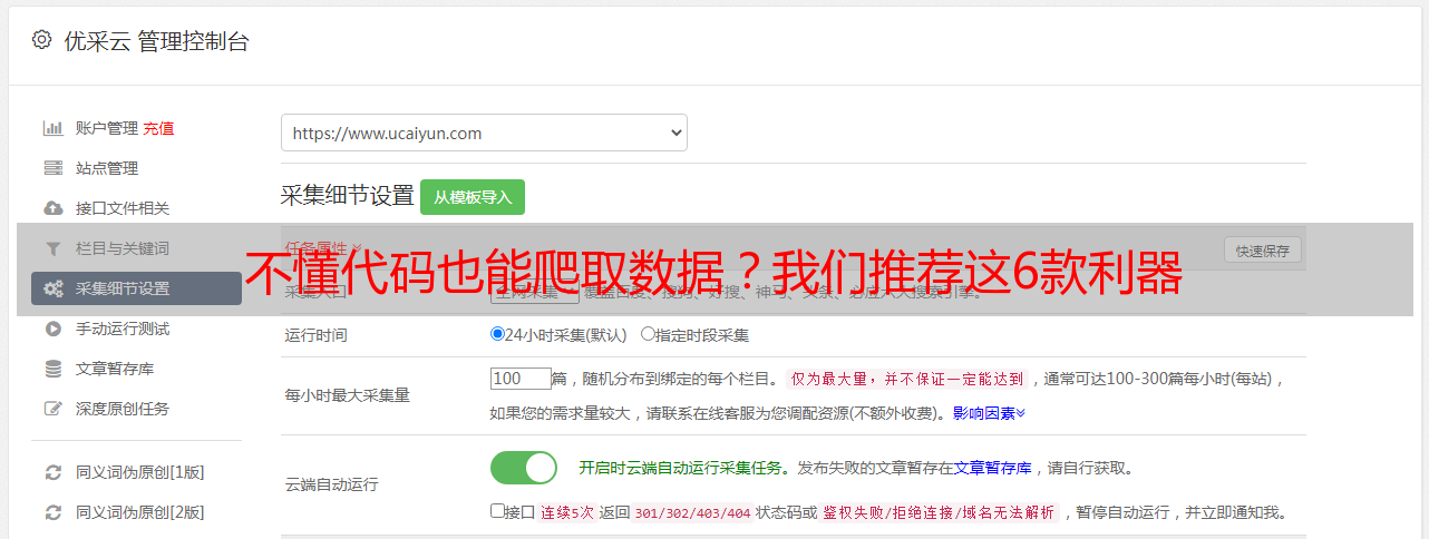 优采云采集器是一款十分适宜菜鸟的采集器。它具有简单易用的特性,让你能几分钟中就快手上手。优采云提供一些常见抓取网站的模板,使用模板能够快速抓取数据。如果想抓取没有模板的网站,官网也提供十分详尽的图文教程和视频教程。