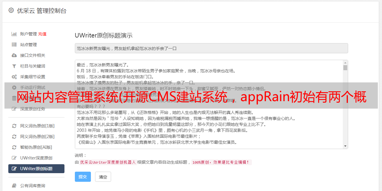 优采云 发布时间: 2021-09-22 06:26网站内容管理系统(开源CMS建站系统,appRain初始有两个概念完美结合)