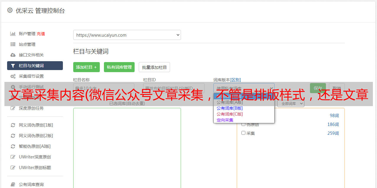② [采集文章] 按钮位于右侧功能按钮的底部。