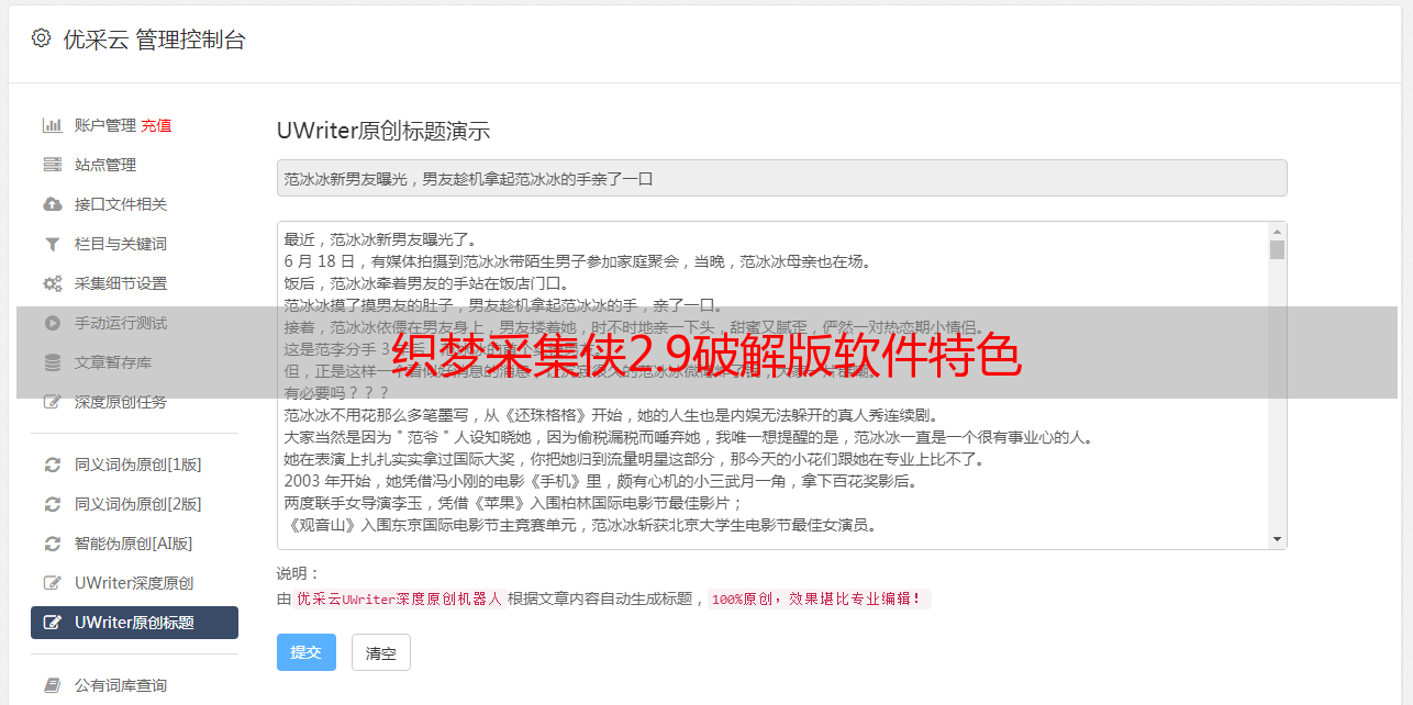 可预先设定是采集任务,然后全手动完成进行伪原创,导入,生成,操作无需人工干预