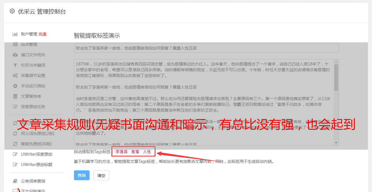 1、比如在文章中添加一些小标签代码,比如H1、H2、强、颜色标签等,这些搜索引擎会比较敏感,在一定意义上可以加深他们的理解。原创 文章的判断。