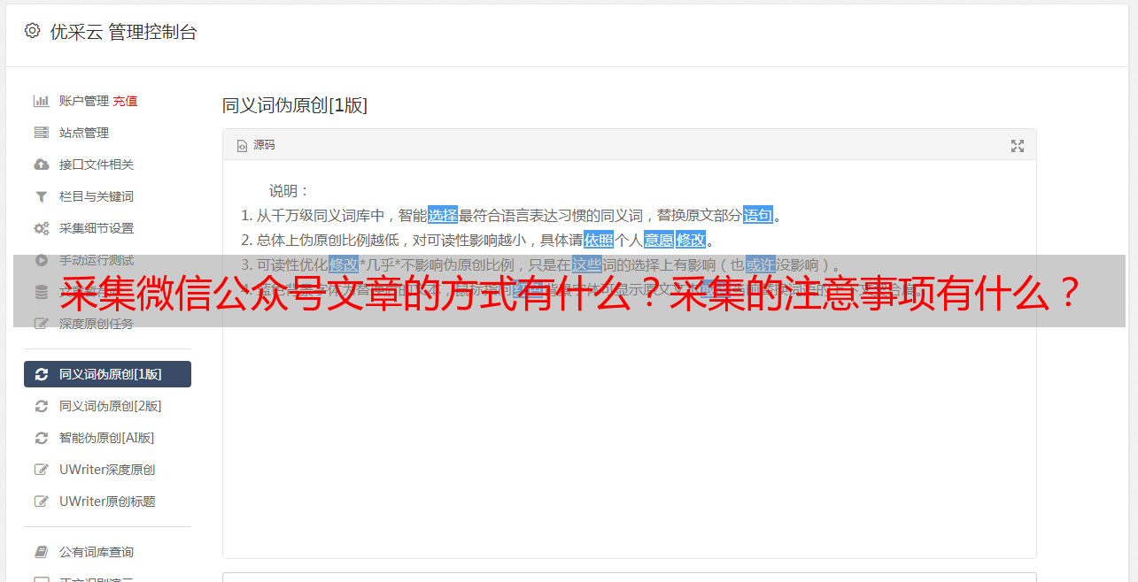 可以批量粘贴关键词进行搜索,选择采集内容日期,可以对标题及内容伪原创,以及辨识文章是否原创,支持文章一件分发到网站。