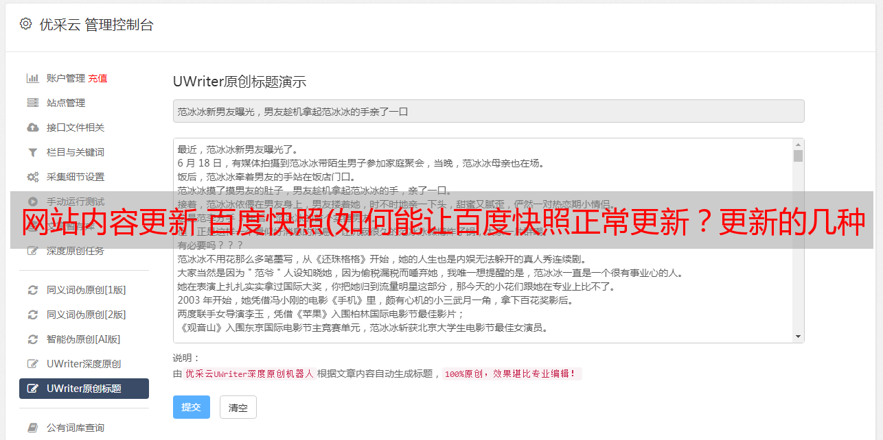优采云 发布时间: 2021-10-02 09:03网站内容更新 百度快照(如何能让百度快照正常更新?更新的几种方法)