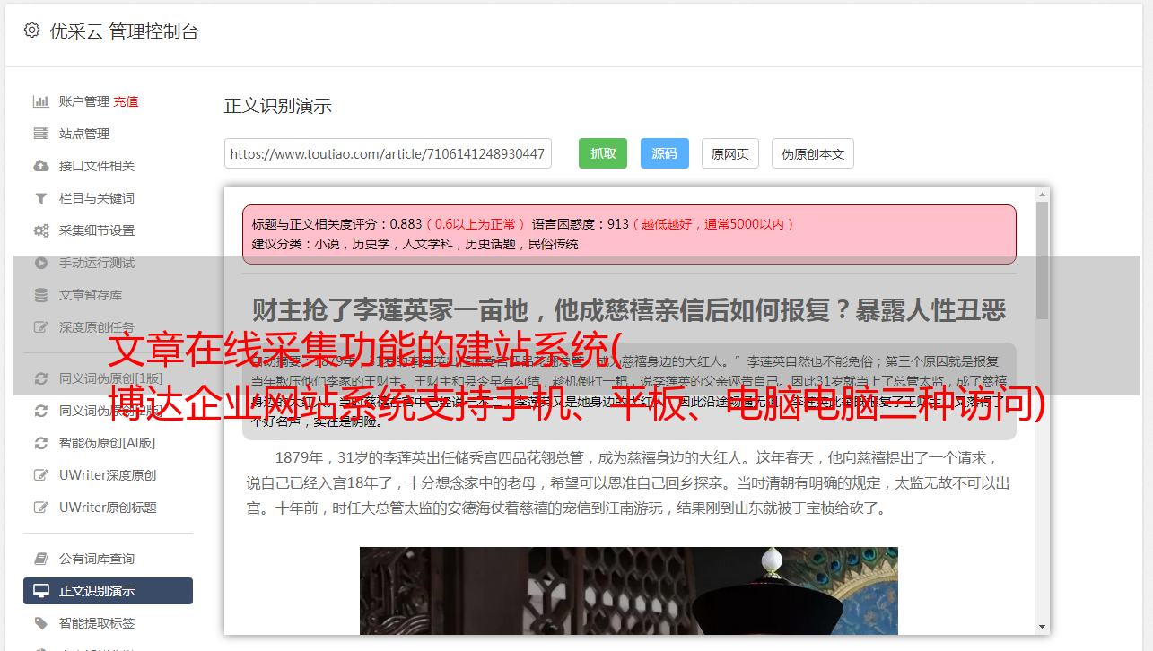 文章在线采集功能的建站系统( 博达企业网站系统支持手机、平板、电脑电脑三种访问)