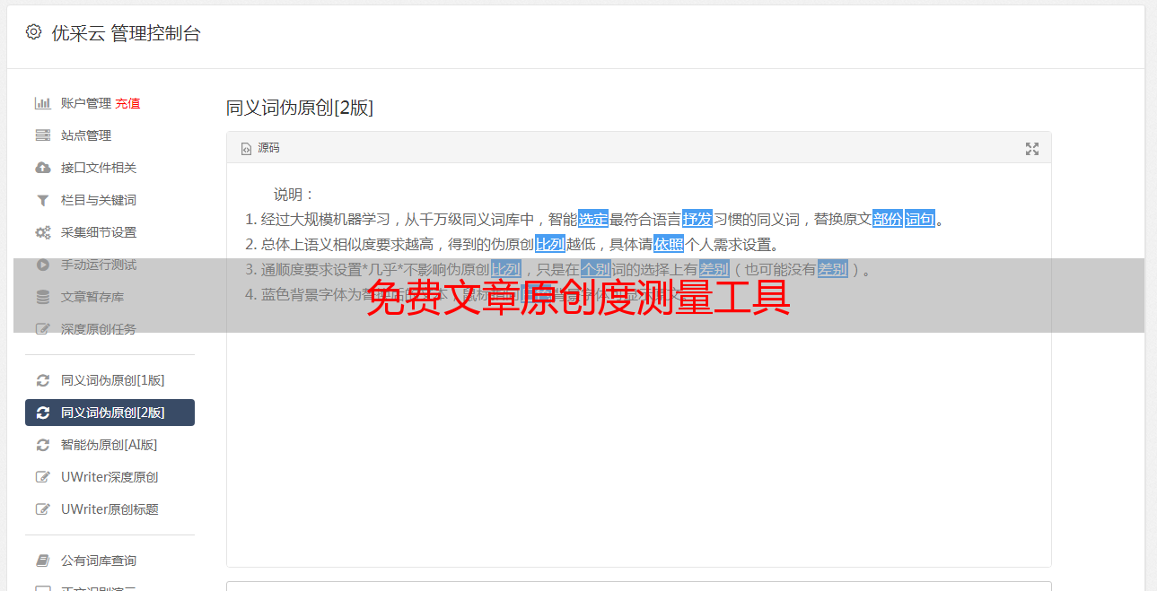 免费文章原创度测量工具,帮你提升文章通过概率,现在的自媒体人就会碰到各种各样的麻烦,其中最大的麻烦就是内容推荐不高,或者根本就没推荐的问题,这个问题困惑你们已久,因为没推荐就没阅读。