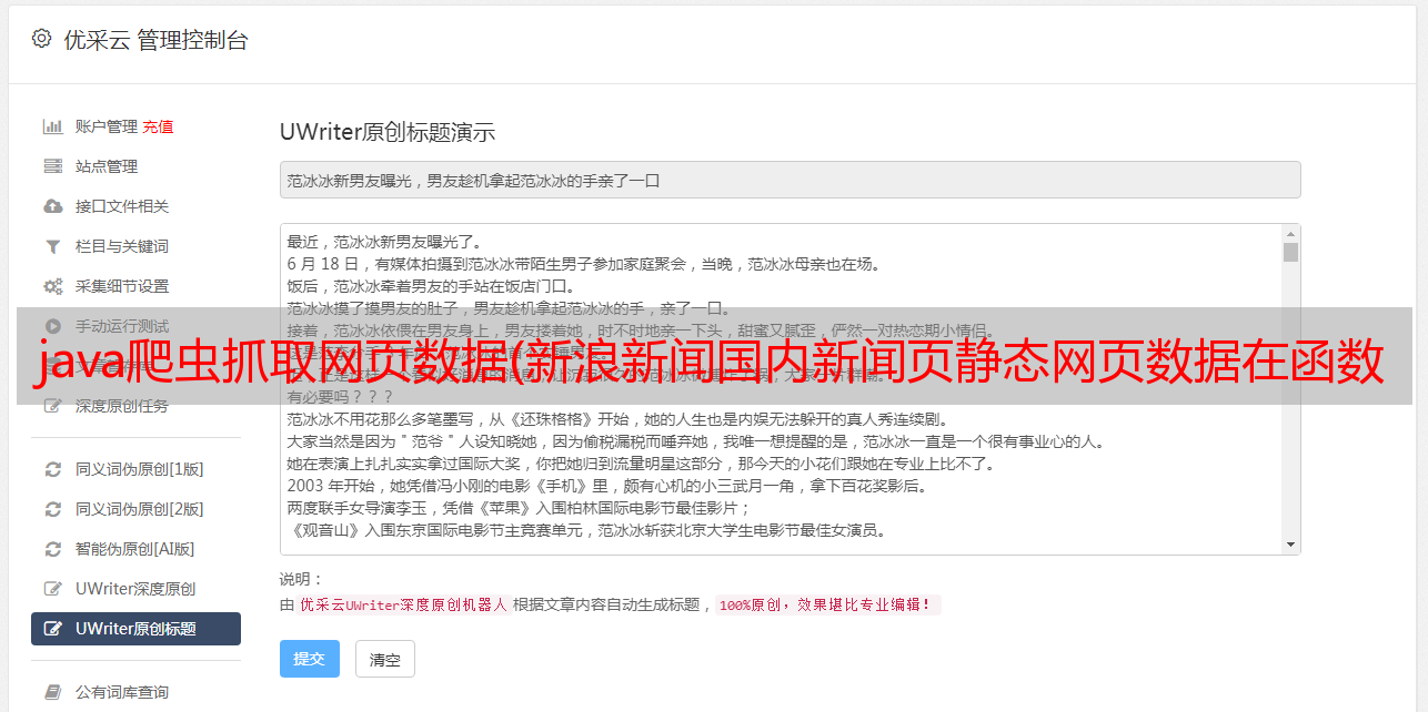优采云 发布时间: 2021-10-04 23:35java爬虫抓取网页数据(新浪新闻国内新闻页静态网页数据在函数中的应用)