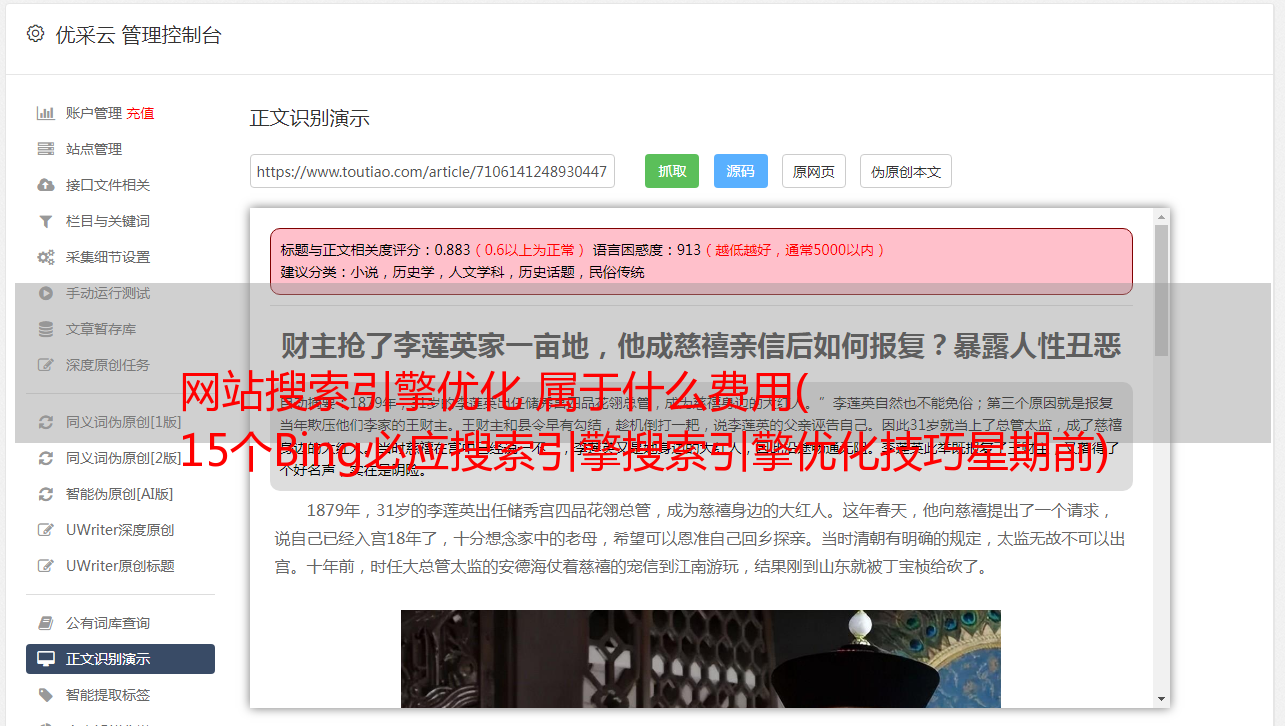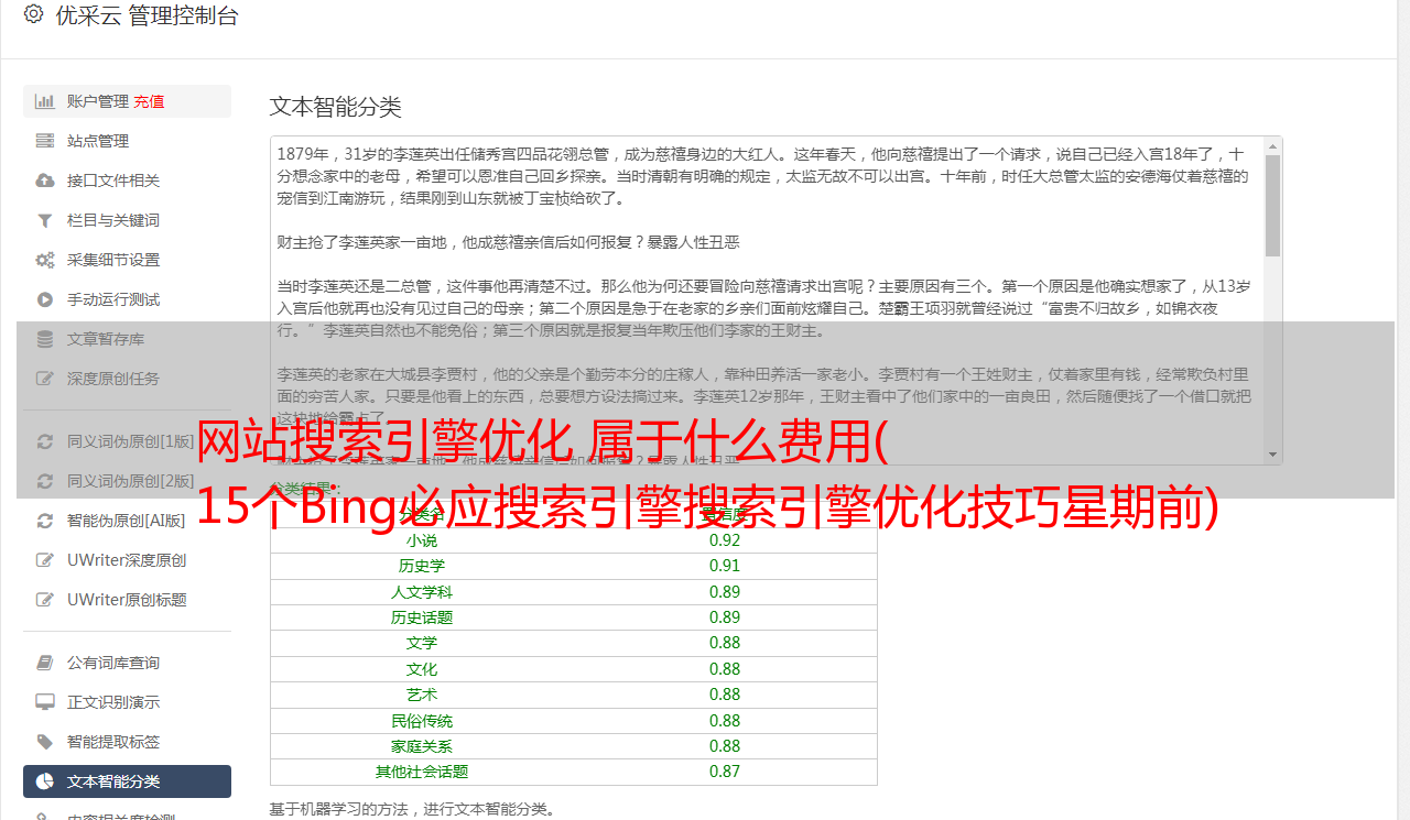 如果这被广泛使用,它可以让搜索引擎更容易、更好地理解和排名页面。开发新服务并以用户友好的方式提交信息。搜索引擎的新协议旨在为他们节省金钱和资源。这是因为它可以完全替代目前使用的每个页面内容理解机制的不同ldquo类型和rdquo数据的昂贵机器学习算法。过去同样的做法可以帮助搜索引擎降低重复内容的成本。我们所说的他们倾向于遵循它并惩罚那些没有改进网站@>的人,因此即使是协议的第一个版本建议的schemaorg也可以帮助您提高排名。我强烈建议你开始使用它,因为很快搜索引擎就会实现它的协议要求并给它加分。东西相对较新。SEO优化的重要因素。有时间可以研究一下相关的协议,开发embedding。4 使用必应网站@>管理中心 必应网站@>管理中心是一个免费网站 长期服务平台,让您查看有多少展示次数和点击次数网站@>统计流量网站@ >. 制定完整的商业计划。教育商业计划。商业计划。医疗项目计划。股权融资项目计划管理。您的搜索率提交站点地图和RSS订阅Bing索引您的网站@>显示工具分析结果检查您网站@>结构和URL网格是绝对必要的,以提高您的排名并了解您的SEO排名的不足之处。推荐使用必应站长工具5制作优质内容。与大多数搜索引擎一样,Bing 会尝试确定哪些网页收录高质量内容。收录的内容是页面的核心内容。在开发网站@>时,如果想开发一个成功且持久的SEO网站@>系统,需要从页面内容和用户体验上考虑以下几点。1 我的网页为用户提供了一些独特的东西还是没有新的东西?2 我有独特的原创 内容还是我只是从中学习 您需要在页面内容和用户体验方面考虑以下几点。1 我的网页为用户提供了一些独特的东西还是没有新的东西?2 我有独特的原创 内容还是我只是从中学习 您需要在页面内容和用户体验方面考虑以下几点。1 我的网页为用户提供了一些独特的东西还是没有新的东西?2 我有独特的原创 内容还是我只是从中学习