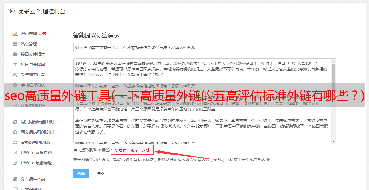 优采云 发布时间: 2021-10-05 20:02seo高质量外链工具(一下高质量外链的五高评估标准外链有哪些?)