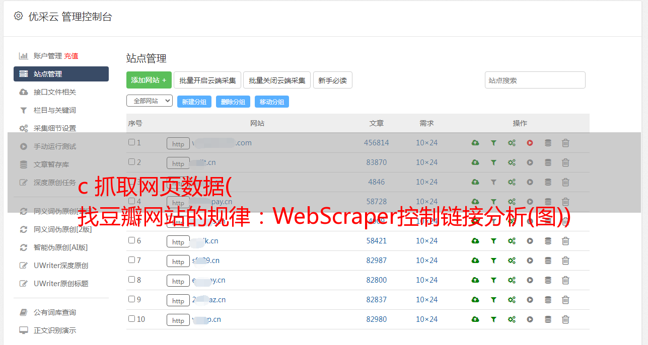 单击站点地图 top250 下拉菜单中的抓取按钮。在新操作面板的两个输入框中输入2000。单击开始抓取蓝色按钮开始抓取数据。抓取结束后,点击面板上的蓝色刷新按钮,检测我们抓取的数据。