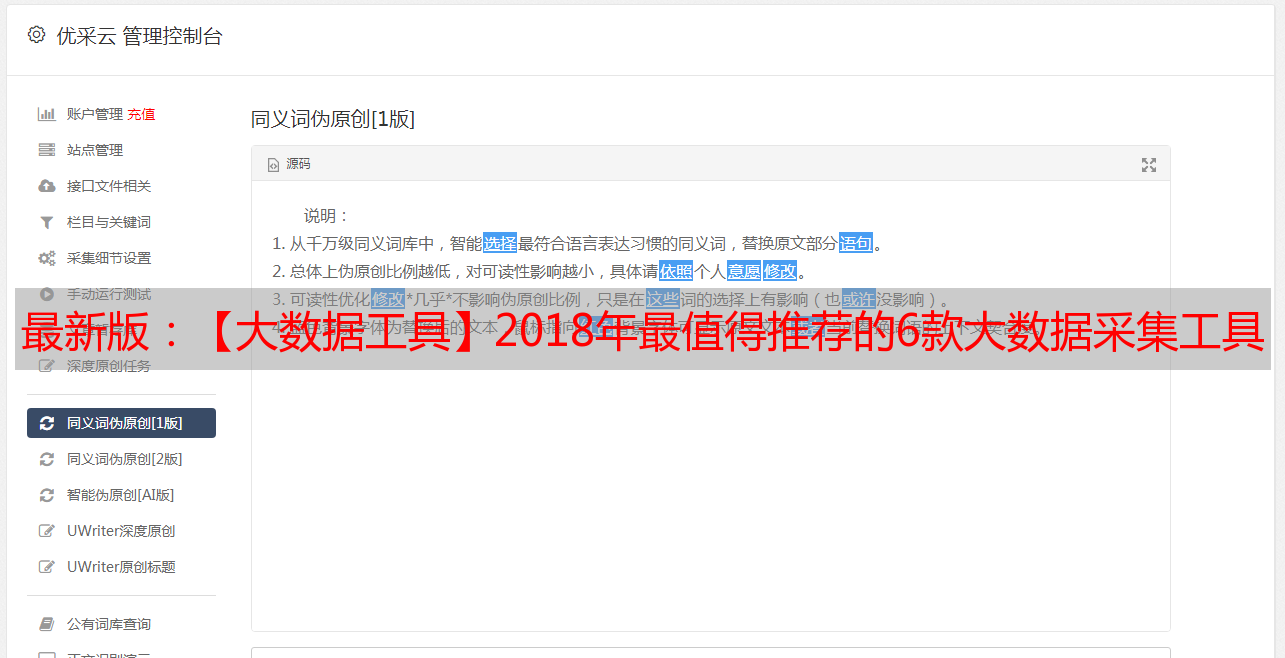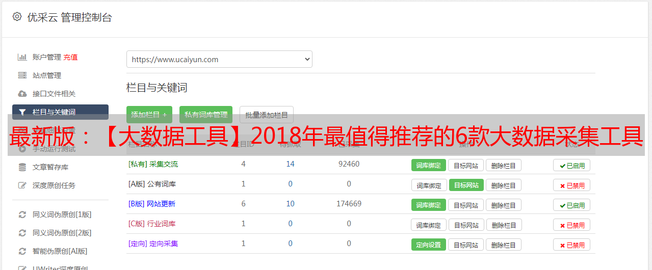 优采云 采集器由合肥乐威信息技术*敏*感*词*开发. 它是一款专业的网络数据采集 /信息挖掘处理软件. 通过灵活的配置,可以轻松,快速地从网页上获取它,可以编辑和过滤结构化的文本,图片,文件和其他资源信息,然后发布到网站后台,各种文件或其他数据库系统.