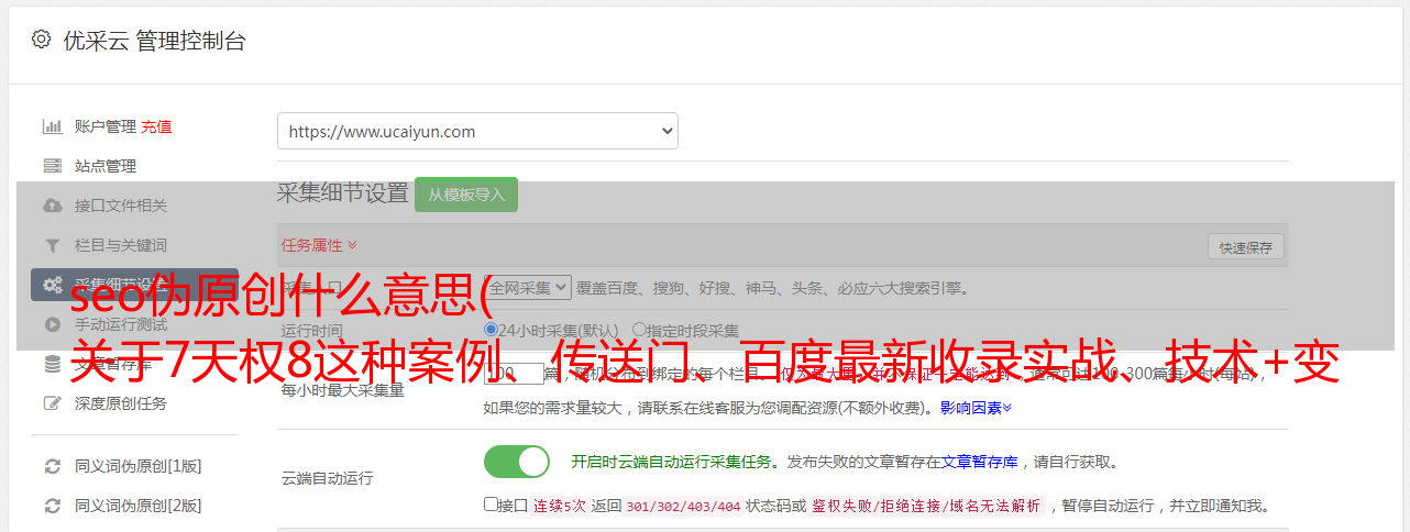 先说网站文章不用伪原创这块,那关于伪原创,在网上,各大seo群里,也有比较多的讨论。话题,毕竟网站还是靠文章吃饭,有没有文章可谈收录?毕竟收录越多,只要你把词库发布得高,你的权重就越大。但是,如果我个人做一些文章,如果你手动复制粘贴,非常非常累人,而且速度也没有太大提升,所以很多大佬想到了采集软件,通过市面上的一些采集器比如优采云等等,有的大佬做了很多伪原创,有的有排名,有的没有,那你就分析一下是否需要做还是不做?