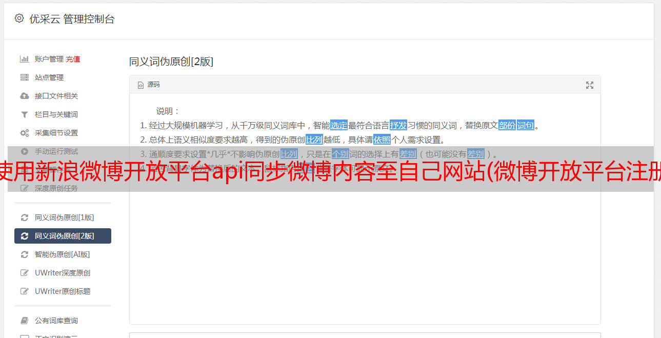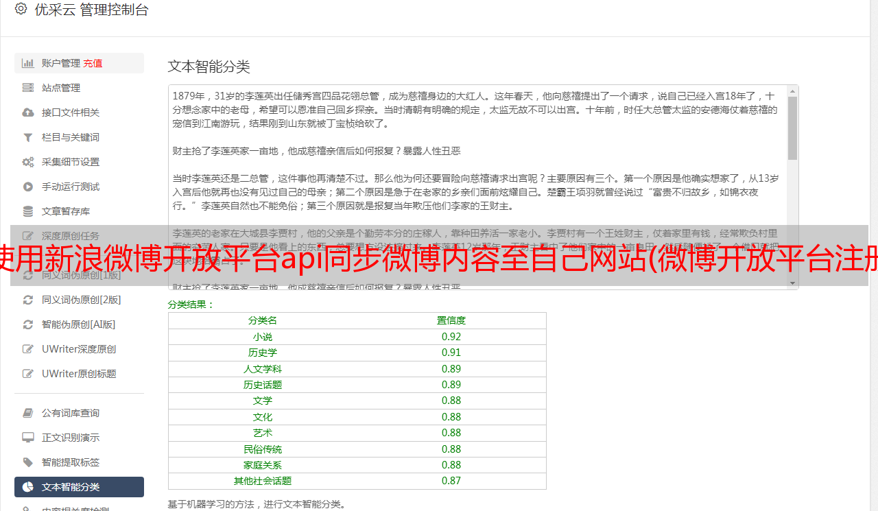 优采云 发布时间: 2021-10-10 10:36使用新浪微博开放平台api同步微博内容至自己网站(微博开放平台注册开发者并获取app和appsecret百度很容易)
