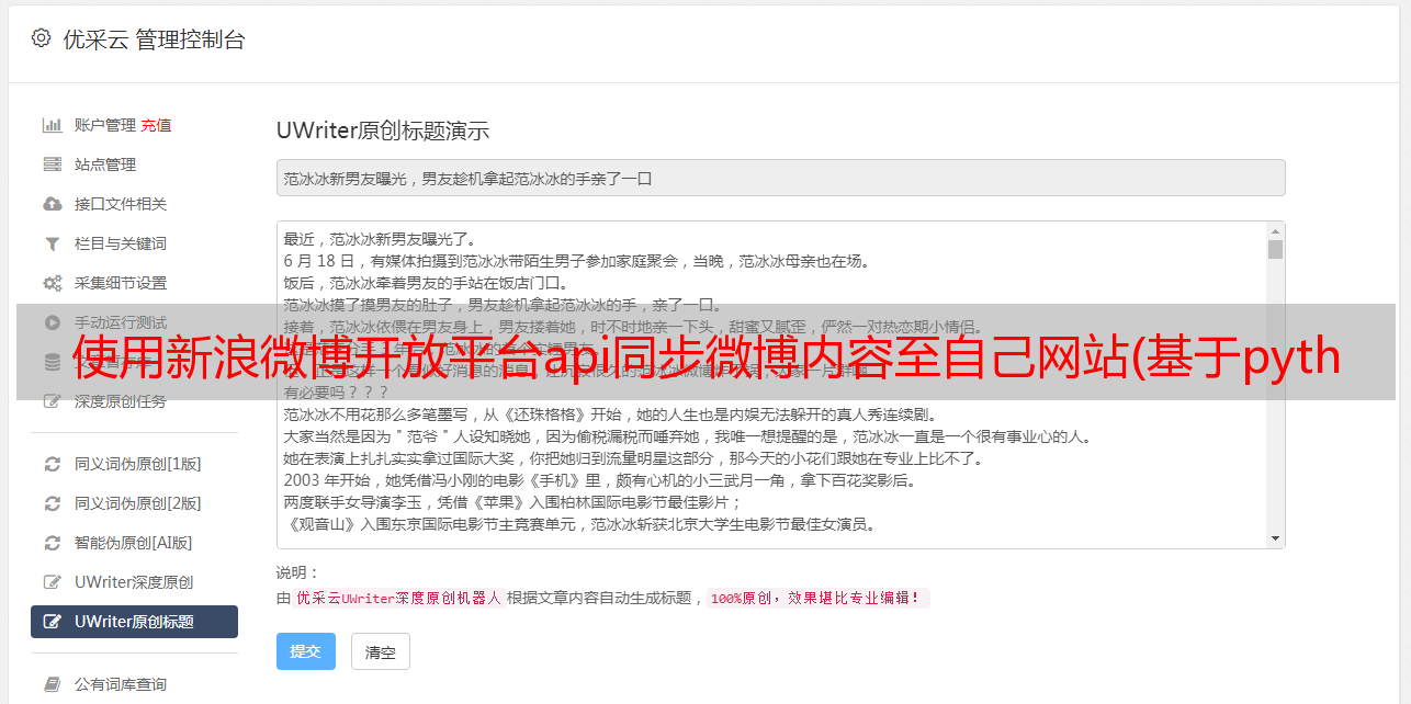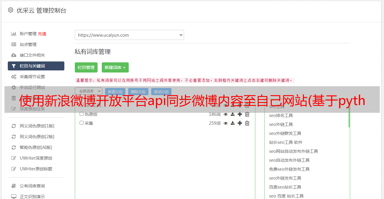 优采云 发布时间: 2021-10-10 21:05使用新浪微博开放平台api同步微博内容至自己网站(基于python的开放平台签名、加密解密以及授权认证测试体系)
