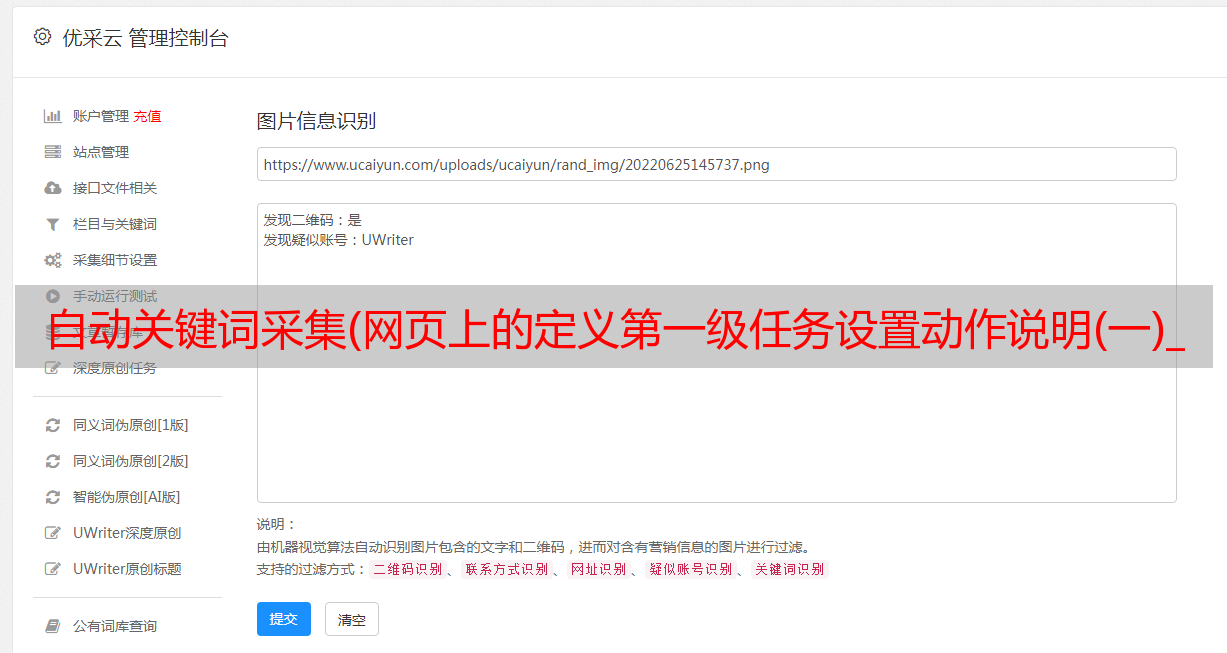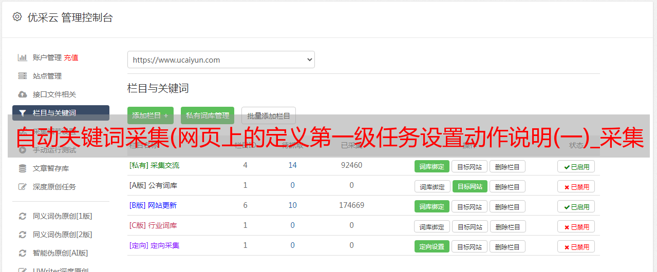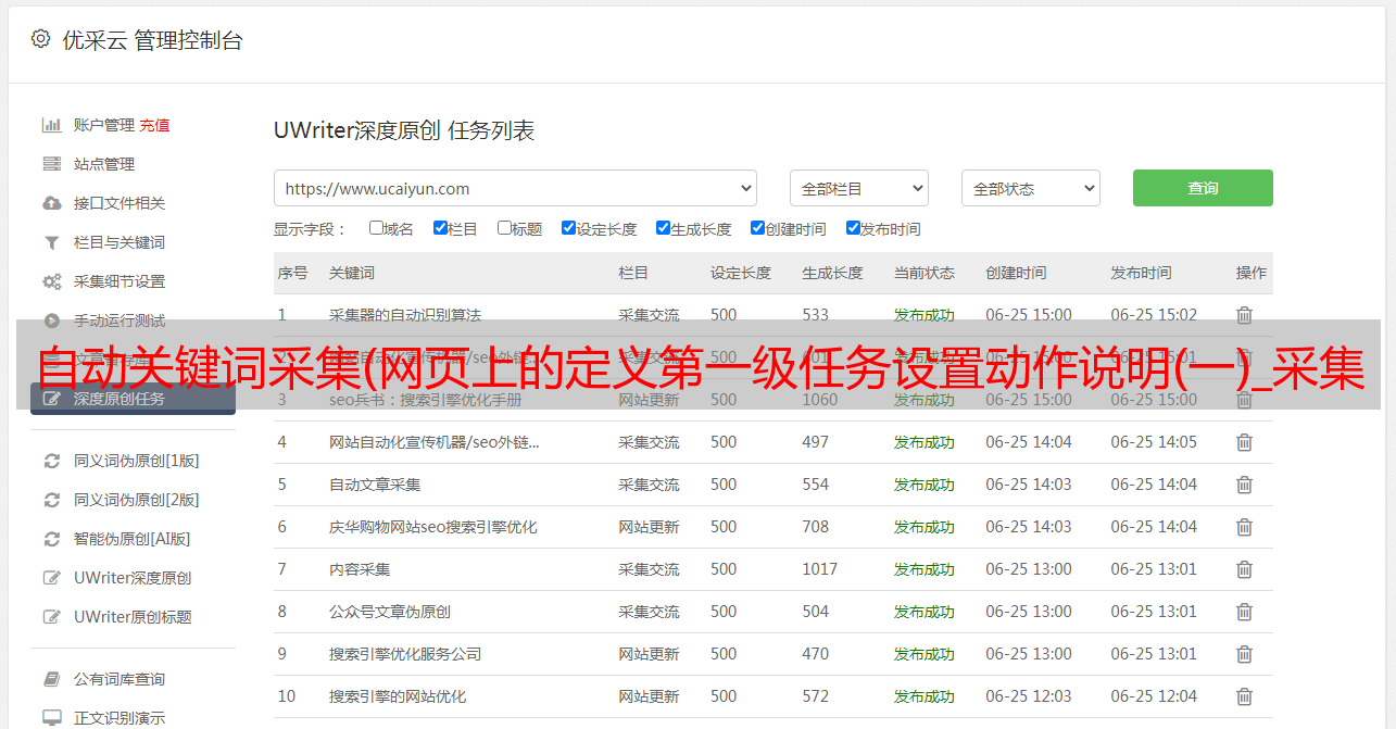 优采云 发布时间: 2021-10-12 10:28自动关键词采集(网页上的定义第一级任务设置动作说明(一)_采集内容)
