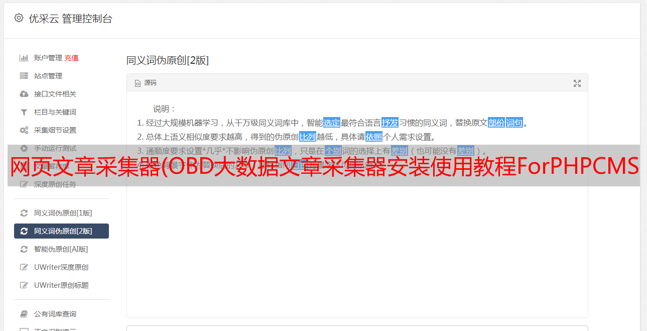 优采云 发布时间: 2021-10-12 16:47网页文章采集器(OBD大数据文章采集器安装使用教程ForPHPCMSPHPCMS图文教程)