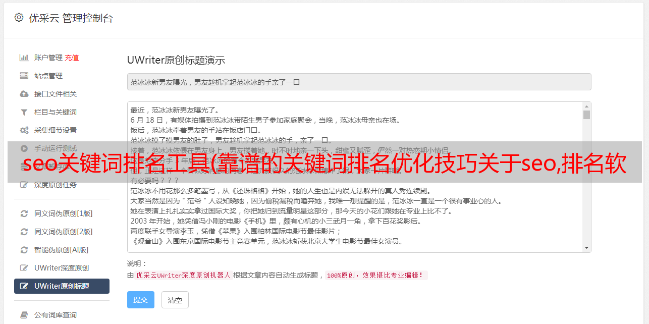 优采云排名完全由我们的开发者自主研发。独家核心资源保证全国最低价格,单导最高2分。平台可支持在线支付和实时到账。拥有清晰的充值金融体系,优采云快排独立的内部核心IP资源区别于市面上各种挂机软件。IP乱七八糟,完全模拟真实用户的操作。引导效果更逼真、真实,效果稳定持久。绝不会被视为作弊而受到惩罚,绝对安全放心。针对性引导,对应搜索引擎中的设置,智能自动翻页,自动清除浏览痕迹,cookies,清除浏览缓存,导览有效,每日最大导览量和页面停留时间全开。指导深度,针对性强,避免空洞,提高效率!
