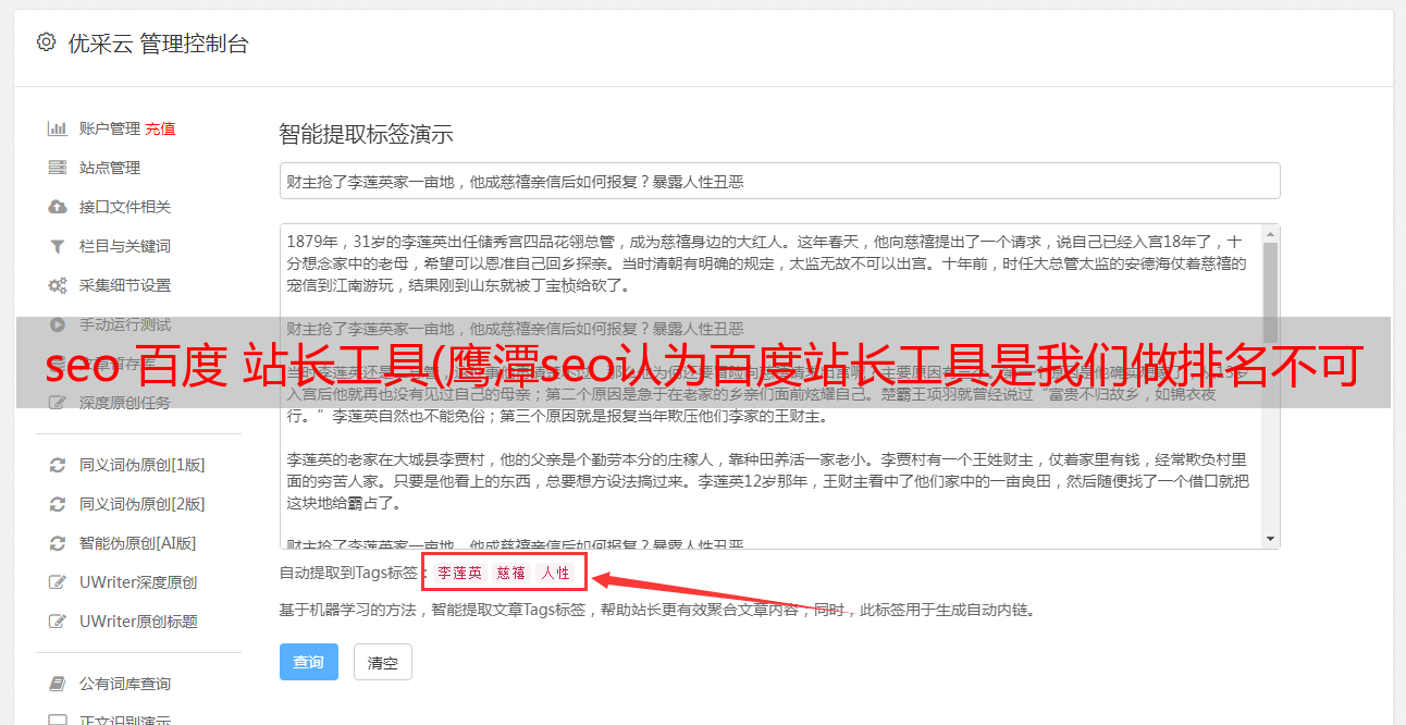 优采云 发布时间: 2021-10-14 01:34seo 百度 站长工具(鹰潭seo认为百度站长工具是我们做排名不可或缺的吗)