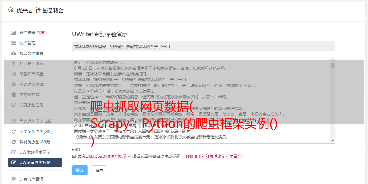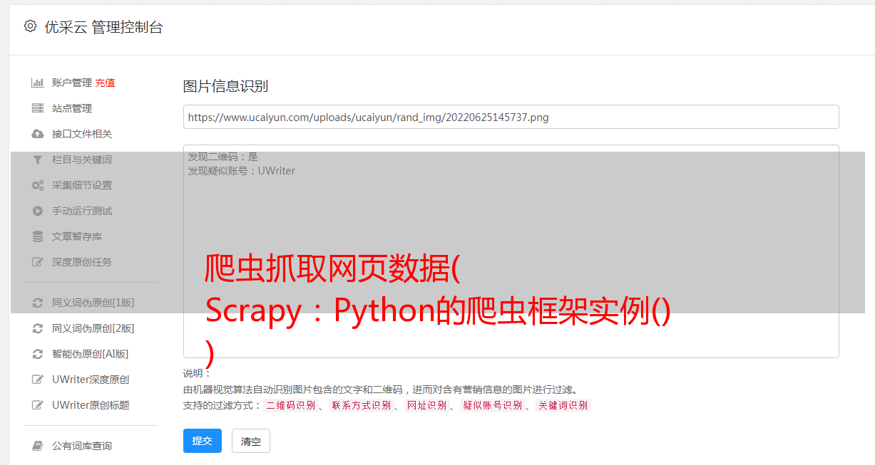 该引擎用于处理整个系统的数据流处理和触发事务。调度器用于接受引擎发送的请求,将其压入队列,当引擎再次请求时返回。下载器用于下载网页内容并将网页内容返回给蜘蛛。蜘蛛,蜘蛛主要是工作,用它来制定特定域名或网页的解析规则。项目管道负责处理蜘蛛从网页中提取的项目。他的主要任务是澄清、验证和存储数据。当页面被蜘蛛解析后,会被发送到项目管道,数据会按照几个特定的顺序进行处理。下载器中间件,Scrapy 引擎和下载器之间的钩子框架,主要处理Scrapy引擎和下载器之间的请求和响应。Spider中间件,Scrapy引擎和蜘蛛之间的一个钩子框架,主要工作是处理蜘蛛的响应输入和请求输出。调度中间件,Scrapy引擎和调度之间的中间件,是Scrapy引擎发送给调度的请求和响应。使用Scrapy可以轻松的完成在线数据采集的工作,它已经为我们做了很多工作,不需要花大力气去开发。是从 Scrapy 引擎发送到调度的请求和响应。使用Scrapy可以轻松完成在线数据采集的工作,它已经为我们做了很多工作,不需要花大力气去开发。是从 Scrapy 引擎发送到调度的请求和响应。使用Scrapy可以轻松完成在线数据采集的工作,它已经为我们做了很多工作,不需要花大力气去开发。