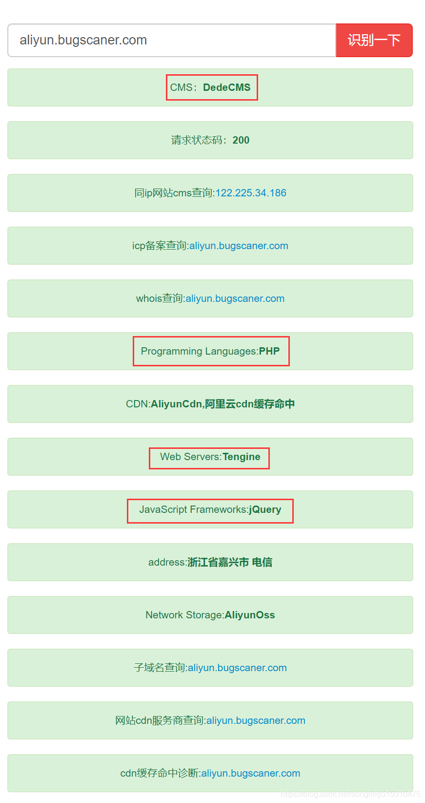 如下图,从指纹辨识可以晓得该站点用的DedeCMS,这样就可以从网上搜索DedeCMS的漏洞,进行突破。