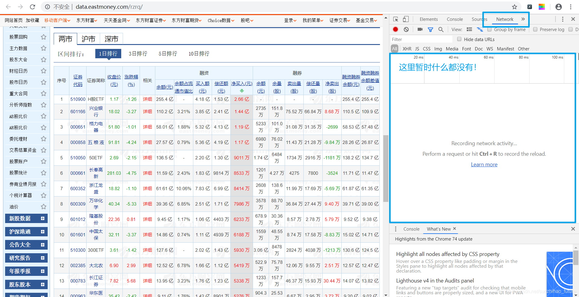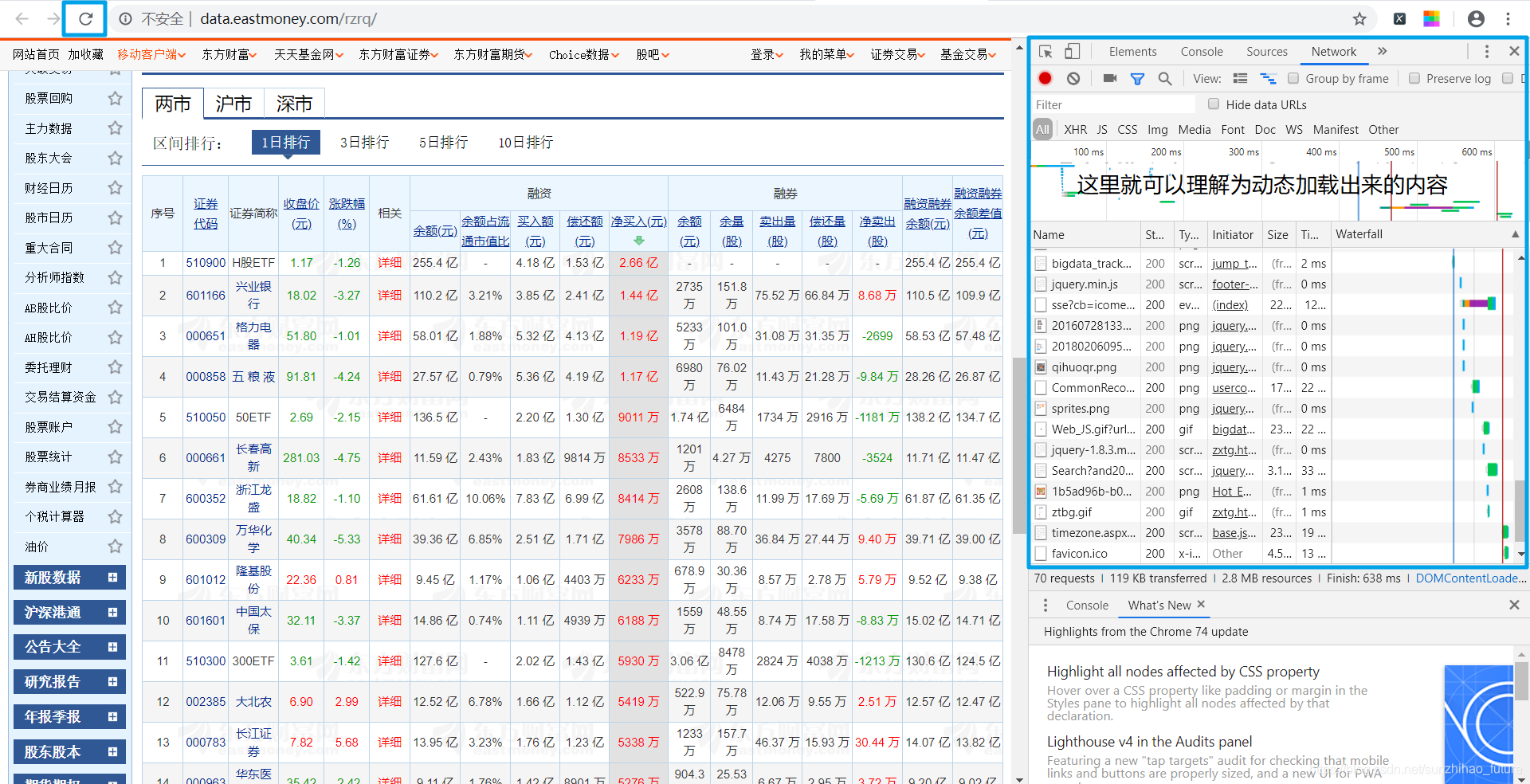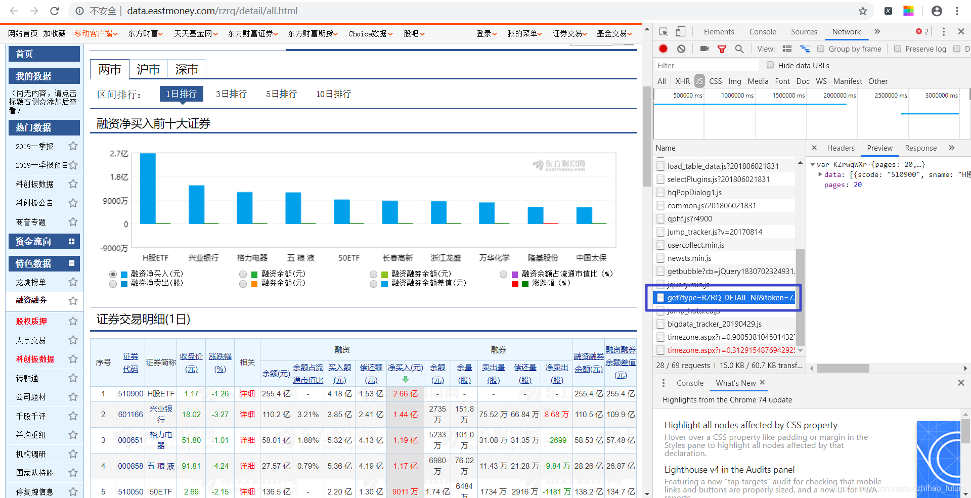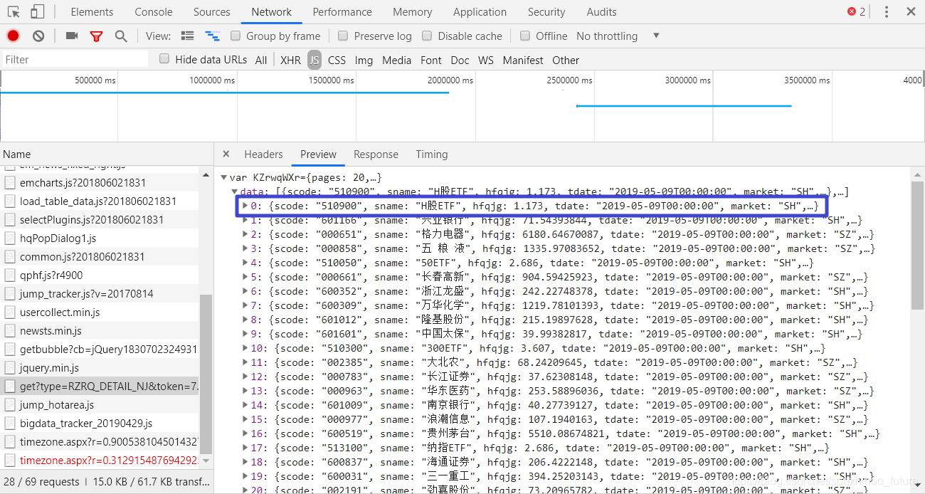 首先点击查看更多数据进入证券交易详情页面。接下来,从所有刚刚动态加载的内容中寻找我们想要的数据。虽然我们不知道它会是什么类型的数据,但如果不出意外,它肯定会出现在这里。经过不懈的搜索,我找到了以下文件。